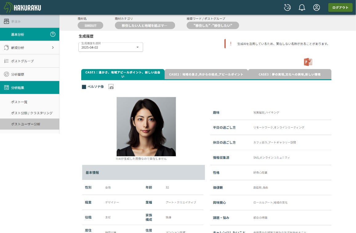 検索ワード・商材名・カテゴリの3つを入力するだけですぐに分析を開始、3種類のペルソナ、カスタマージャーニー、ストーリー、カテゴリーエントリーポイント(CEP)等が生成されます。また、実際の投稿リスト(ポスト一覧)を確認できるのはもちろん、投稿内で同時に出現する共起語のリストやクラスタリングの結果、AIによる投稿分類も同時にアウトプットされます。