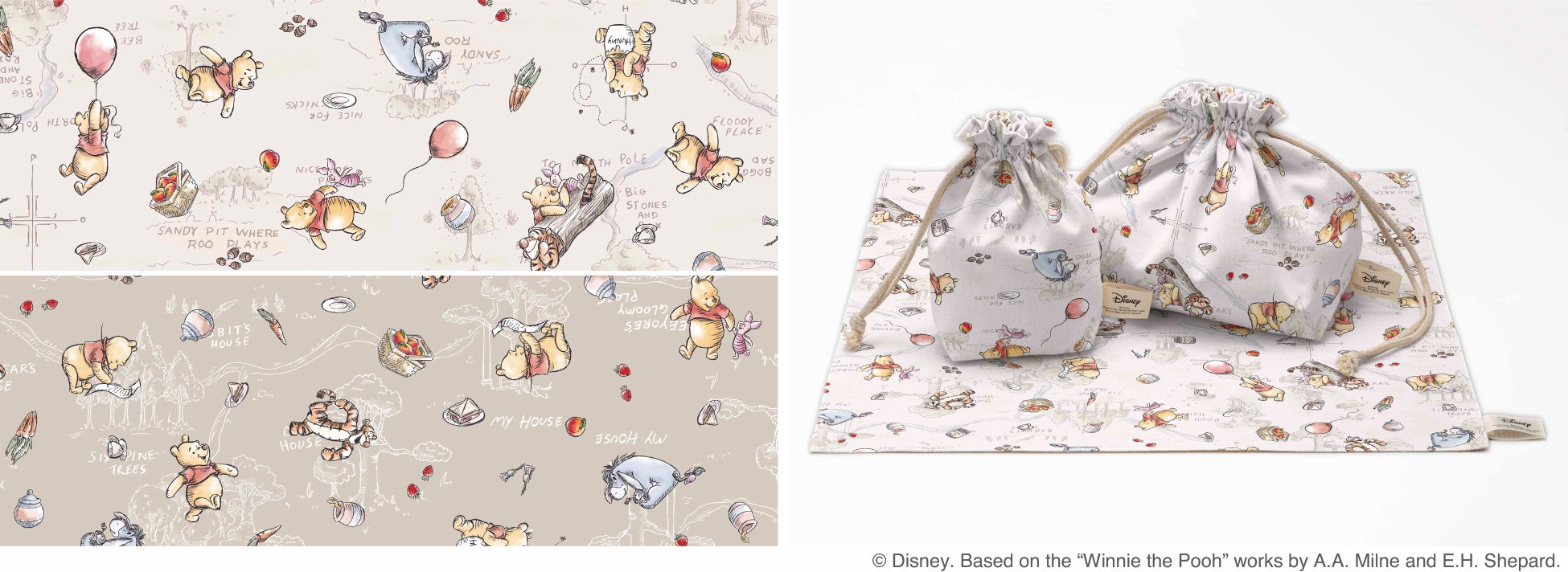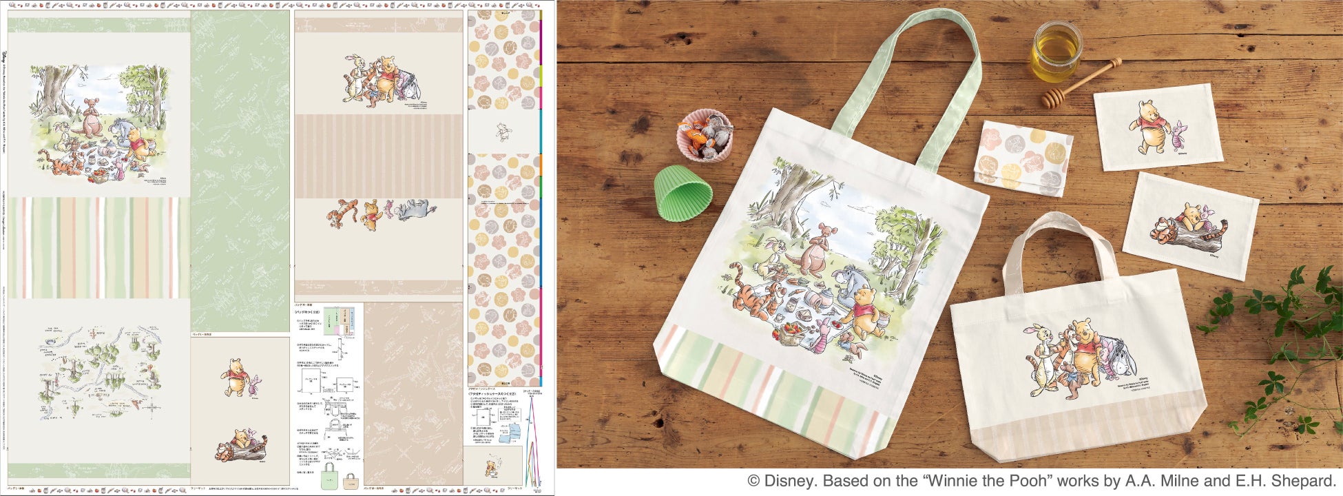 100エーカーの森にいるくまのプーさんとなかまたちをプリントした生地を2柄発売。印刷された案内線に沿って裁断し、縫い合わせるだけで、バッグ2個とティッシュケースができるパネルクロスは、手軽にソーイングを楽しめて、クオリティの高いアイテムを作ることができます。