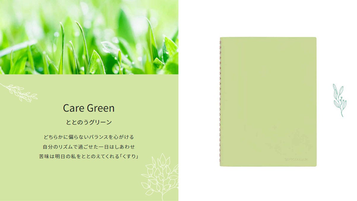 セプトクルールのカラーは、「気持ちを前向きに、そっと後押しする」ことをコンセプトにストーリー開発しています。2023年の限定カラーは、不確実性が高まる時代だからこそ、心を落ち着かせて自分と向き合う時間を過ごしてほしいという思いから、「ケアグリーン」と「カームオレンジ」の2色をチョイスしました。