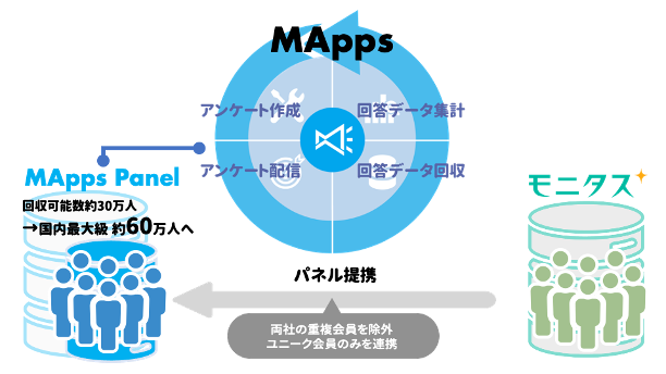 モニタスモニター連携後の「MApps forSurvey」・「サーベロイド」アンケート実施時回答数は全国で最大約60万名規模となり、国内最大級のアンケート回答回収数となります。