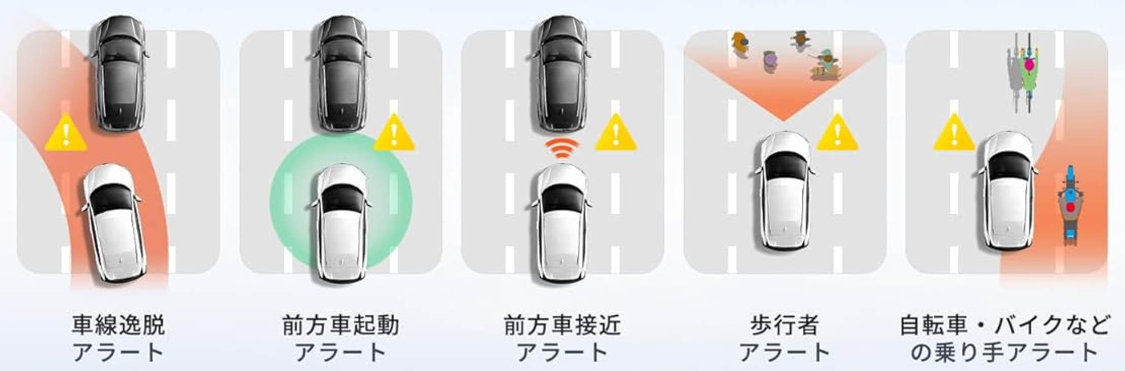 ADAS(先進運転支援システム)を搭載することで、車両や歩行者、自転車などが関わる危険な状況を把握し、ドライバーに的確に表示・警告します。GPS機能が搭載されていますので、事故発生の日時・位置などの重要な情報を記録し、事後に確認する事が可能です。