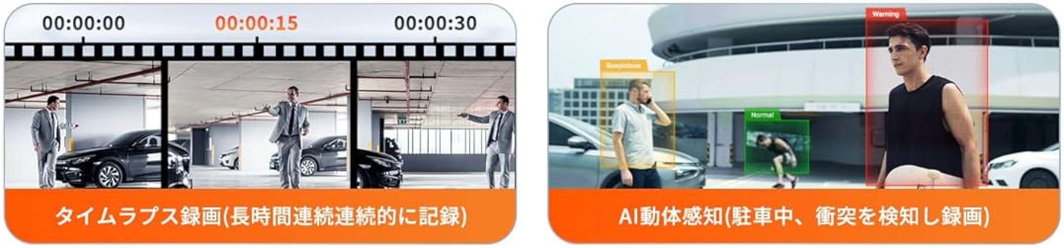 別売のType C駐車監視専用配線「70mai Hardwire Kit+ UP03」を使用すれば、駐車中も24時間記録を行い、いたずらや当て逃げなどにも対応します。また、駐車中の車に不審な動きで駐車中の車に近づく人をAIが感知すると、その人の動きを識別し、自動的に録画します。