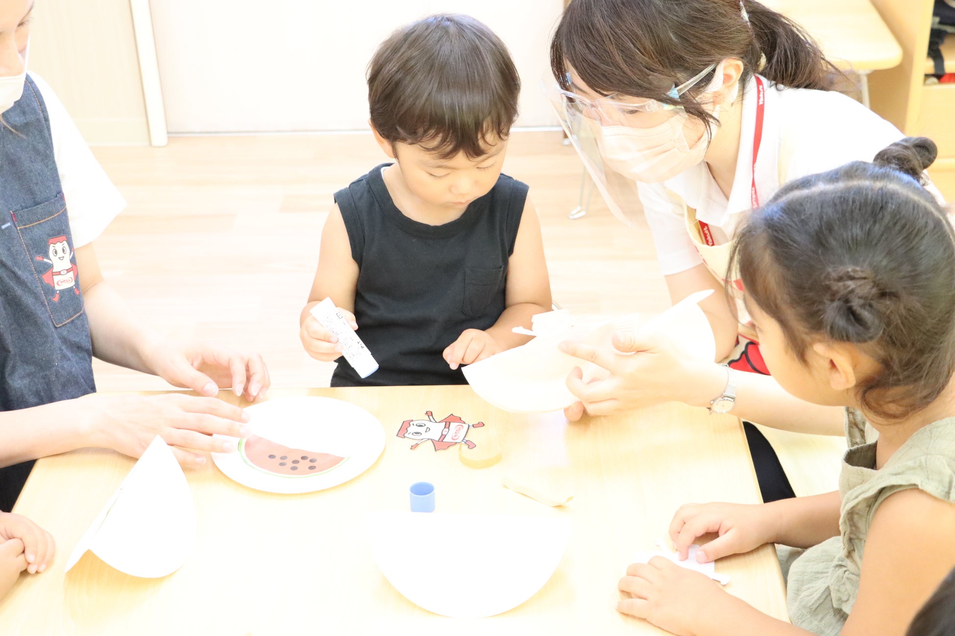 制作遊びでは、紙皿を使った「ゆらゆらスイカとヤクルトマン」を作りました。