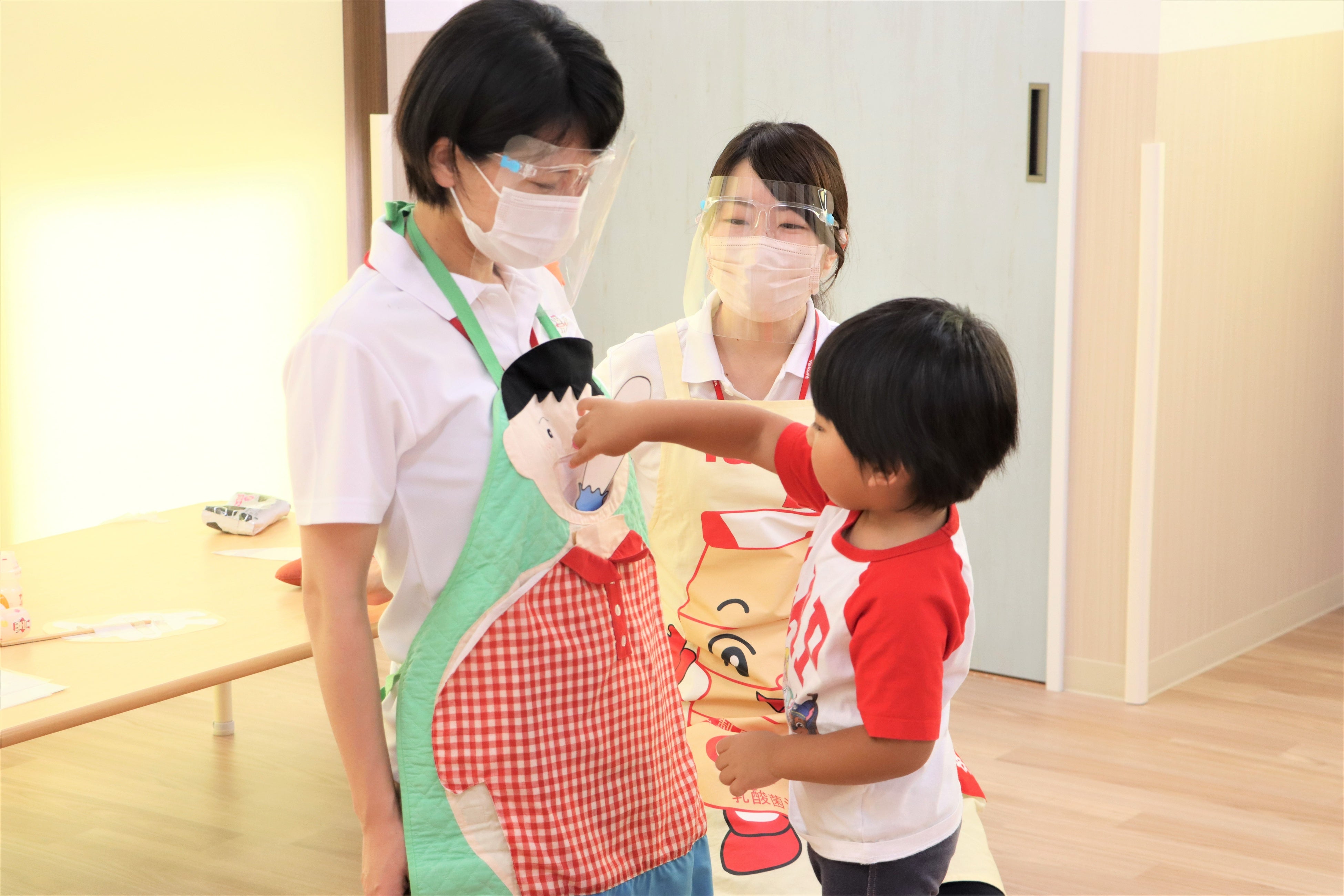 子ども達は、食べ物を食べさせたり、小腸模型を伸ばしたりする体験にドキドキ・ワクワクしながら、積極的に学ぶ姿勢が見られました。いつもどんなウンチがでているか指差しして自分の便の様子を答える姿も見られ、便を見る習慣が子ども達の中にも備わっていることを感じました。制作遊びは、糊をつけたり、シールを貼ったり、楽しそうに取り組む姿が見られました。出来上がった作品を教室が終わった後も嬉しそうに見せていました。