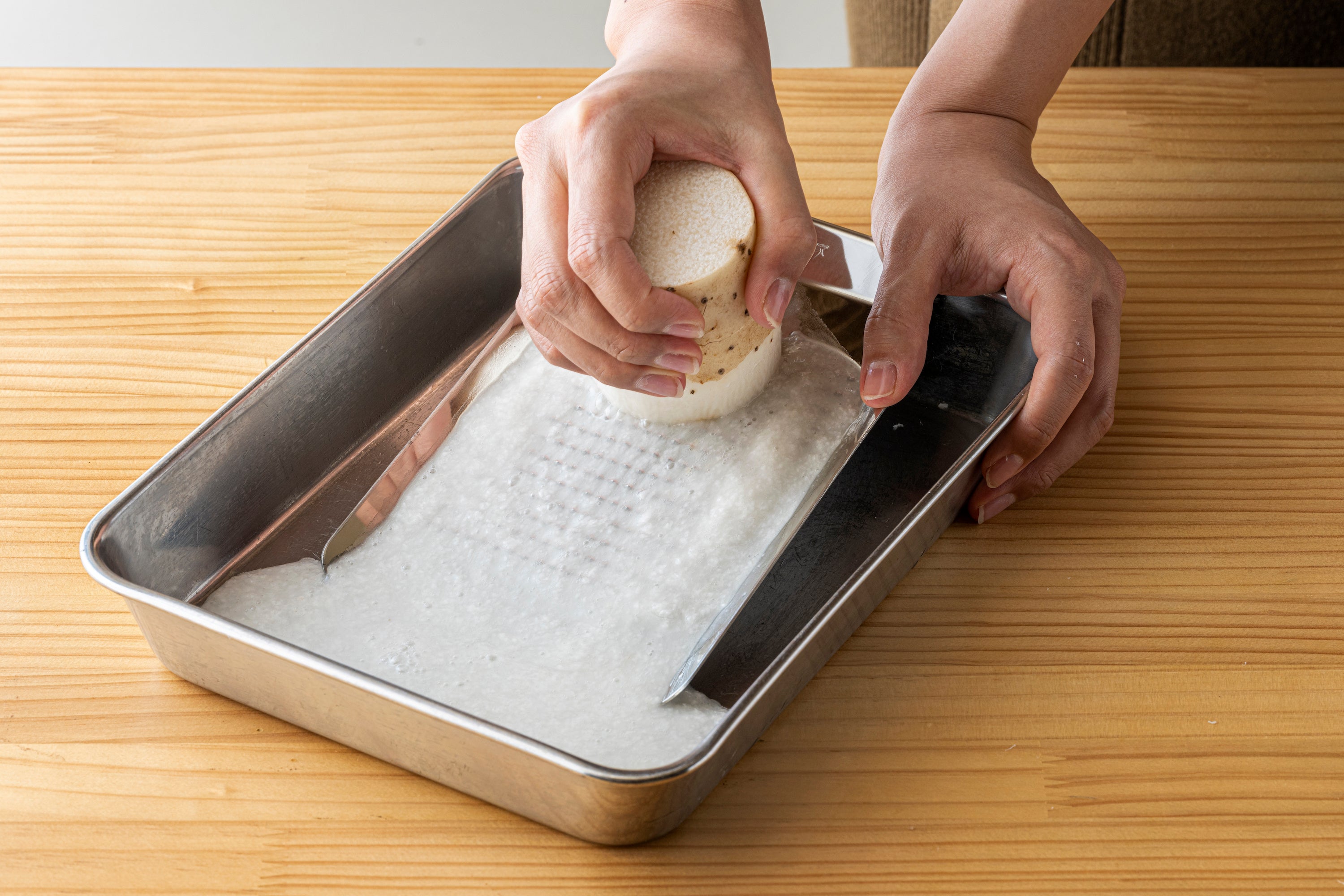 そうすることで、押し出す力で食材をすりおろし、抵抗を感じることなく引き戻せるため、動作を楽に繰り返すことが出来ます。
