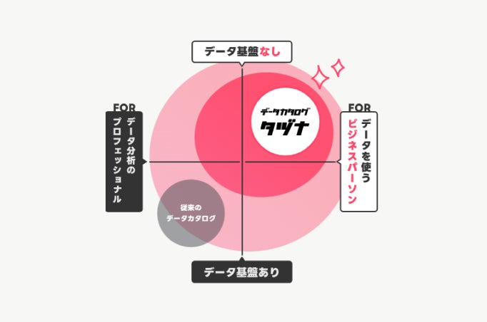 データカタログは、従来、エンジニアや情報システム部門が社内のデータ基盤からデータを検索するためのソフトウェアでした。「タヅナ」はこれを再発明。エンジニアだけでなく、データを利用するビジネスパーソンも簡単に使えるように開発しました。