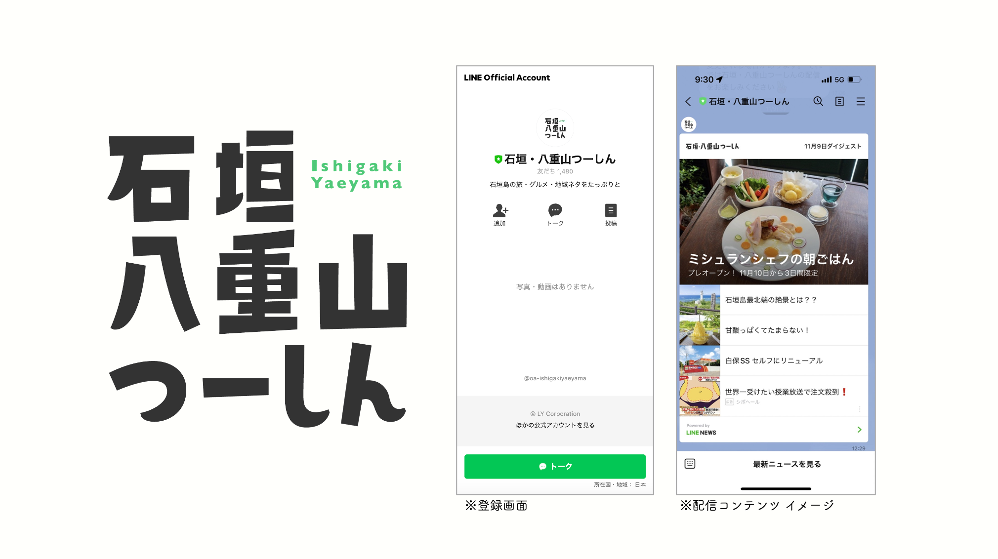 この度の「LINE アカウントメディア プラットフォーム」への参画により、LINEを通じて、近隣にお住まいの皆さまが日常的に使える暮らしに役立つ情報や石垣島をはじめ八重山諸島(竹富島や西表島、小浜島など)を旅する旅行者の、その情報欲しかった!そこまでは知らなかった!を提供していく予定で、地元のレストラン、食堂や商店、マンション・アパート、ホテル、Villaなどあらゆる店舗の開店や閉店情報を素早くお伝えするコンテンツや、地域のイベントやレジャー、石垣島・八重山に数多くあるお土産を紹介していきます。