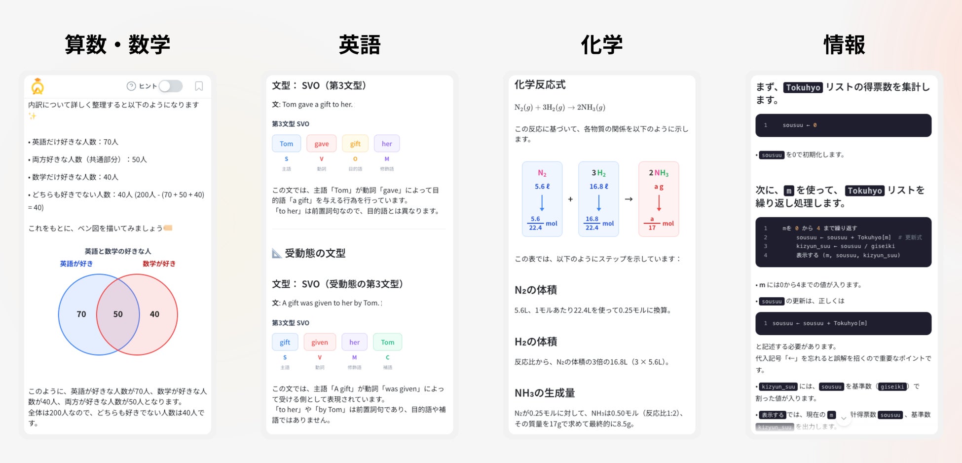 重要ポイントの色分け・数式表示・ステップ解説で、生徒の思考負荷を軽減。英作文の添削にも対応し、修正箇所を視覚的に表示します。