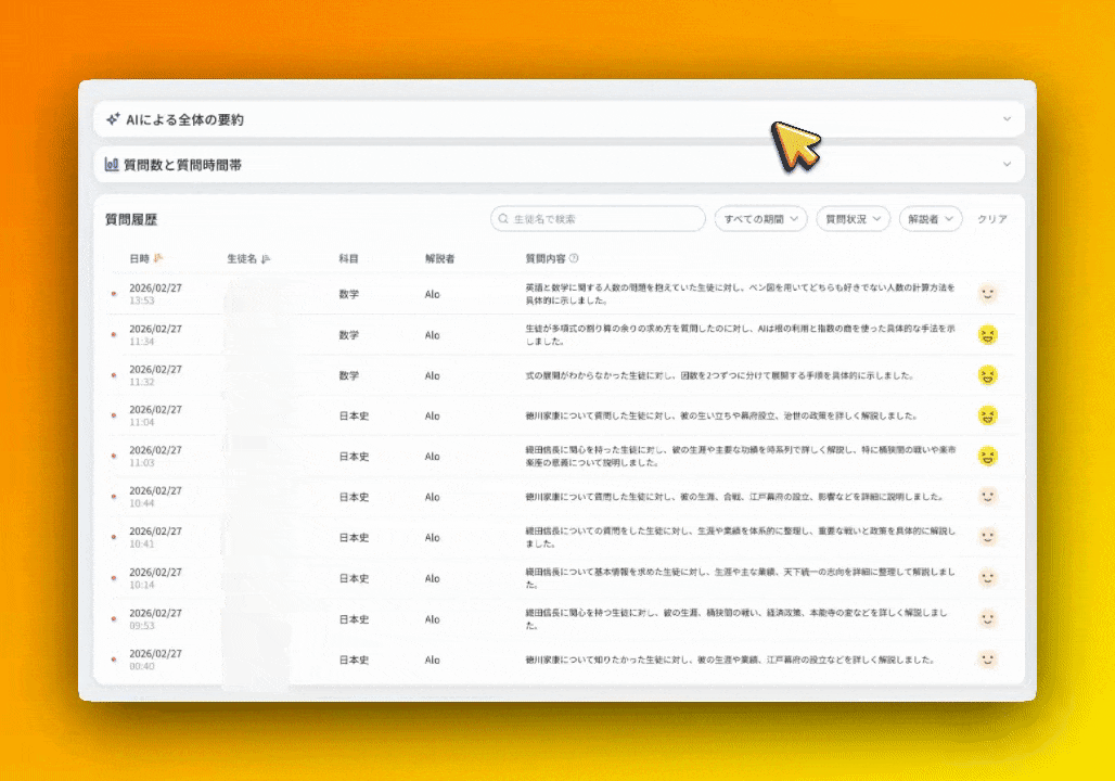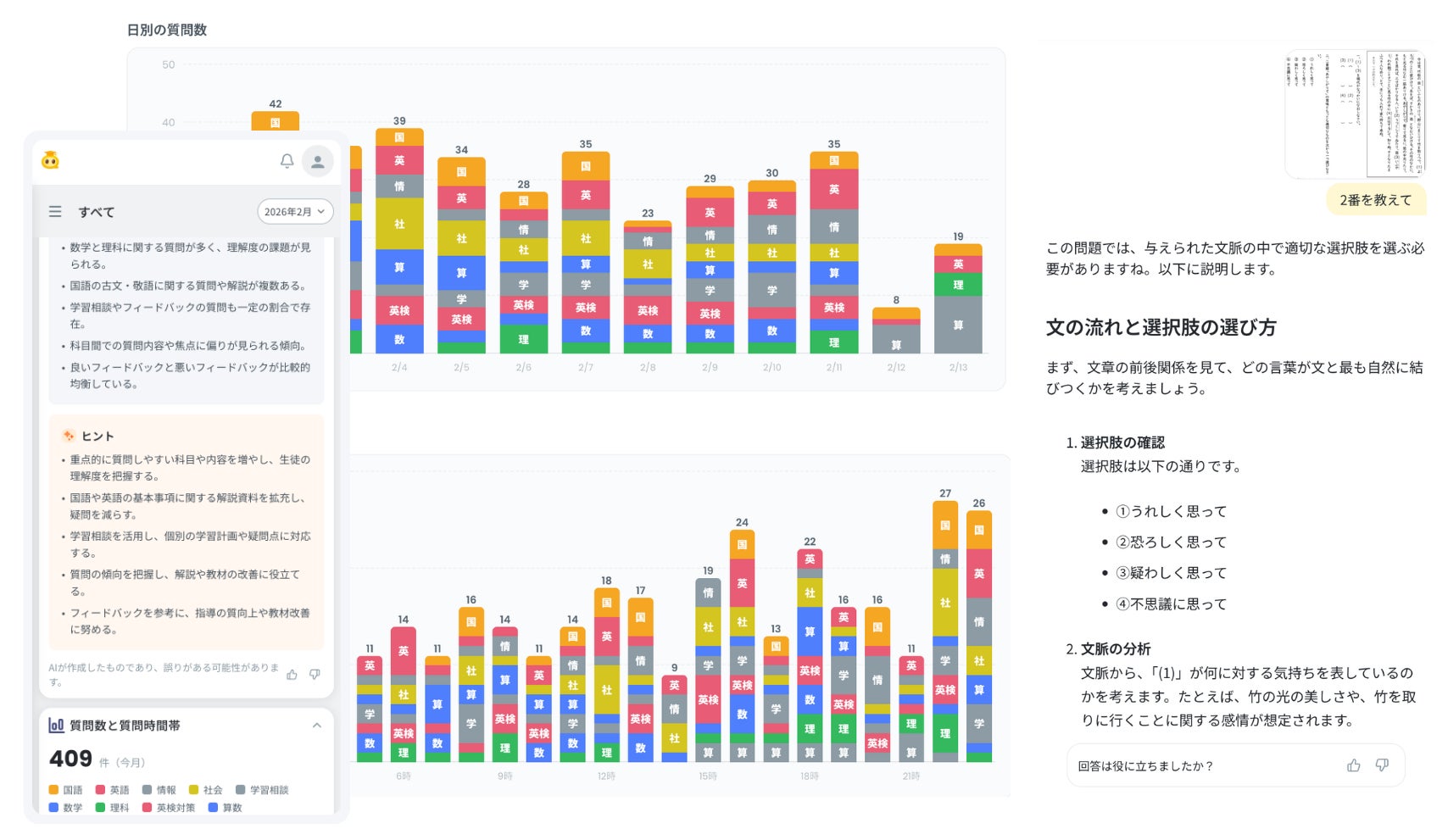 月別・教科別・時間帯別の質問分布をグラフ表示。生徒ごとの質問履歴も一覧で確認できるため、教室全体の傾向把握から個別指導の判断まで、データに基づいた教室運営を支援します。