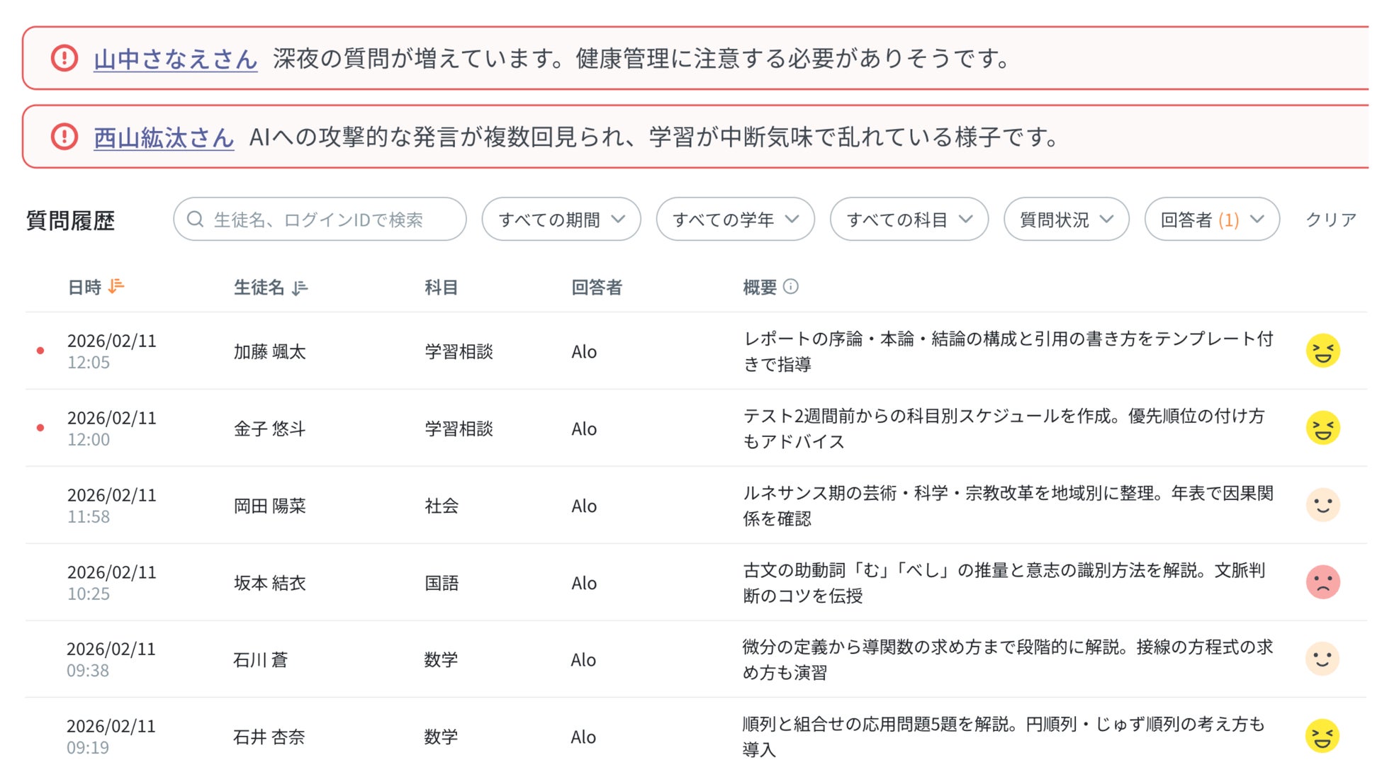 質問内容をAIが自動で要約するため、やり取りを一つひとつ確認しなくても学習状況をすぐに把握できます。深夜学習や不適切な利用はアラートで可視化。保護者面談の前に気になる兆候をキャッチし、迅速なフォローにつなげられます。