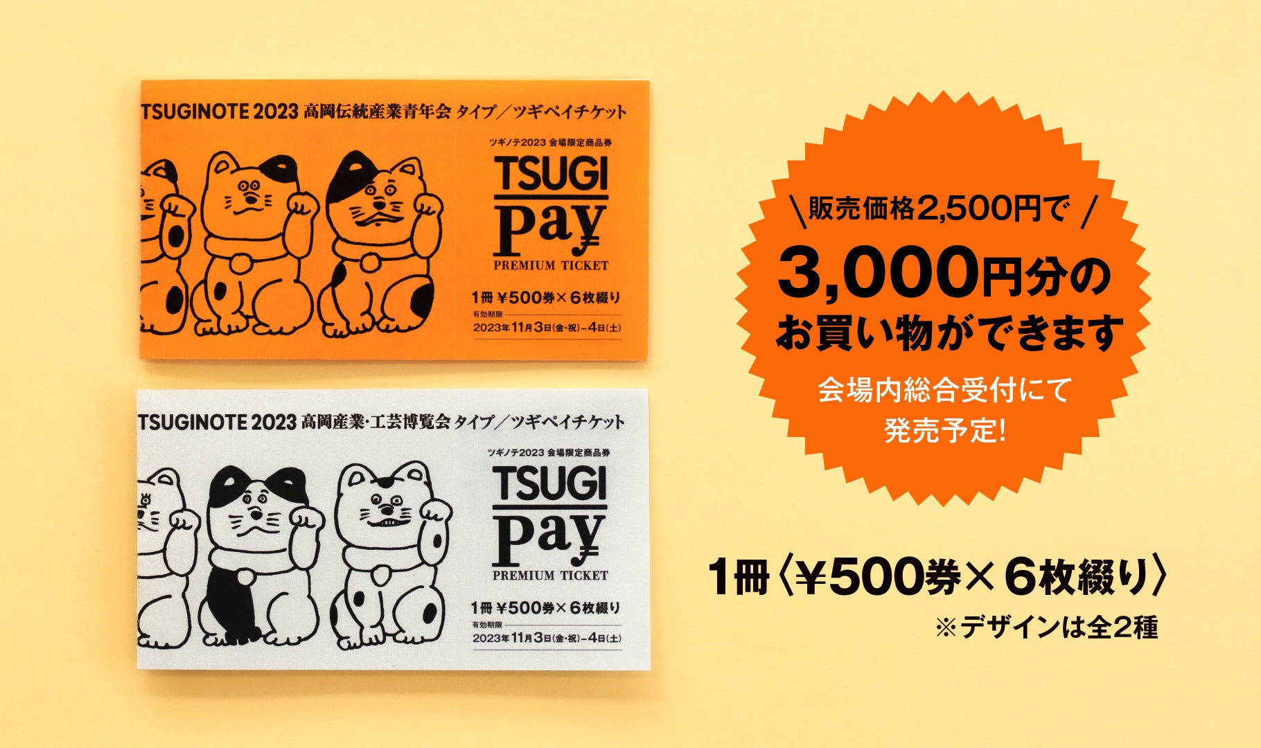 イベント会場の受付で2,500円の「ツギペイチケット」を購入すると、3,000円分のお買い物にお使いいただけます。500円ずつのチケット6枚綴りとなっており、クラフトフェアツギノテ2023会場でのみ使用可能です。ものづくり企業の商品やワークショップ、クラフト作家作品、フードブースでも利用できます(一部、対象外もあります)。