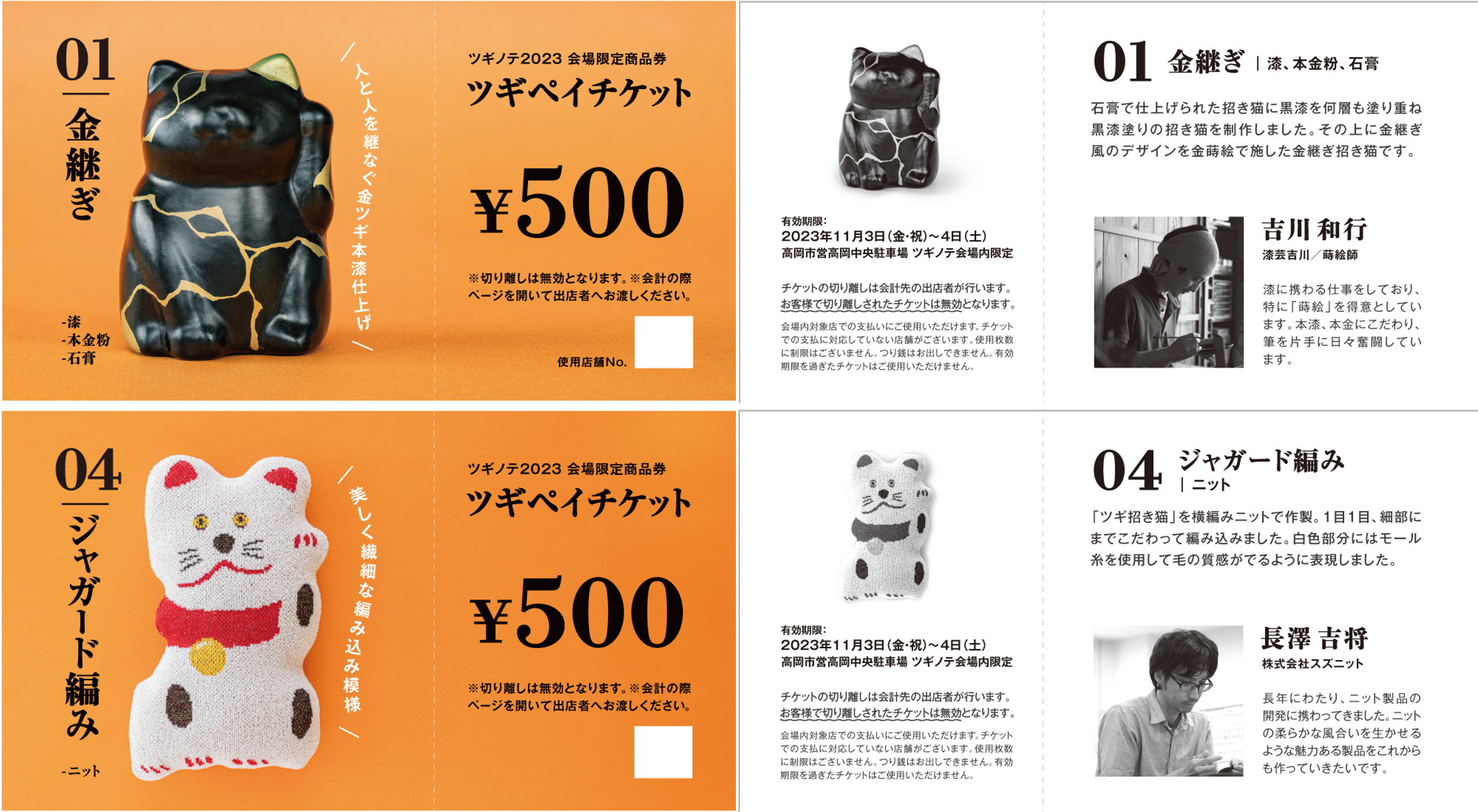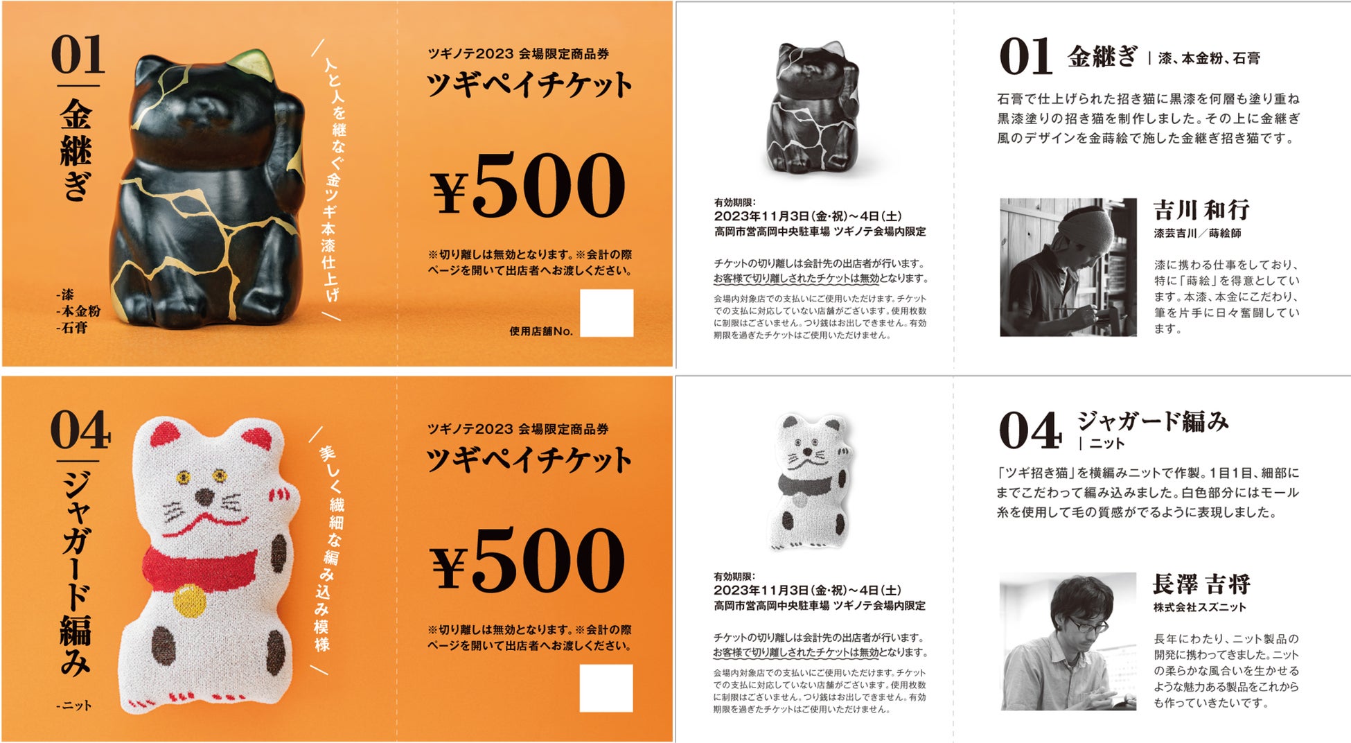 「ツギペイチケット」は、イベントへ参加している12社のものづくり企業が自慢の技術により手がけた12種類のツギノテ公式マスコット「ツギネコ」を紹介するミニブックになっています。チケットを使い終わった後は持ち帰り、企業の技術や職人に関する情報をご自宅で楽しむことができます。