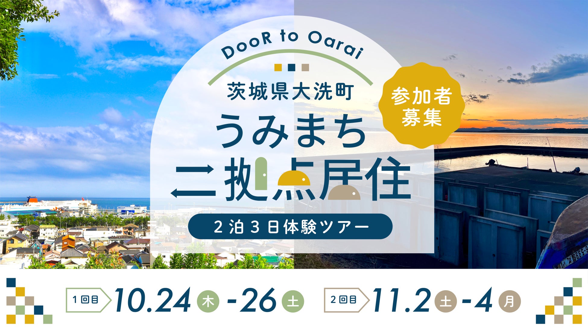 茨城県大洗町にて「大洗町を冒険の拠点にする」をミッションに地域活性化や関係人口創出等の活動を行うまちづくり団体「大洗クエスト」は、今住んでいる地域ともう一つ別の地域に暮らしを持つ「二拠点居住」の2泊3日体験ツアーを2024年10月と11月に開催いたします。開催にあたり、都市圏等に住んでいて、二拠点居住に興味関心がある方や海のあるまちで暮らしたい方など、各回1組(2名)の参加者を募集いたします。