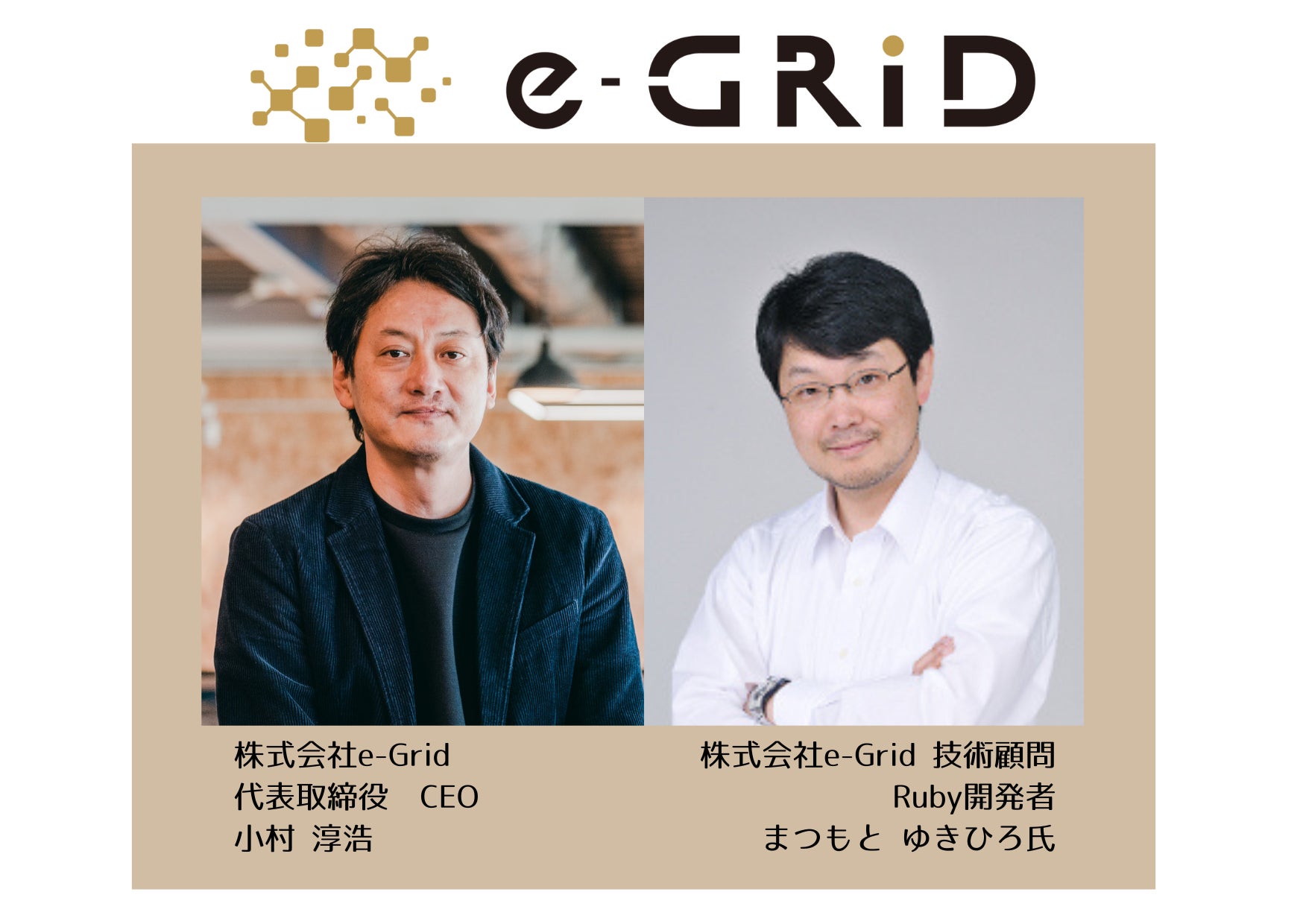 Ruby on Railsを用いたニアショア開発やテレマティクスサービスを展開する株式会社e-Grid(本社:島根県出雲市、代表取締役CEO:小村 淳浩/おむら よしひろ)は、島根県在住で世界的プログラマーであるまつもとゆきひろ氏を、2023年4月より技術顧問として迎え入れたことを発表いたします。