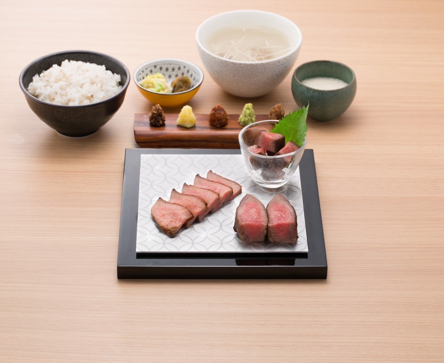 1本のたんから1枚(80~90g)しか取れない希少部位の極撰たんを使用。3種類の切り方で食感の違いを、5種のオリジナル調味料を添えることで彩りと味わいの変化を楽しめる商品。ブランドのシンボルともなっている七宝柄のプレートでご提供いたします。昼夜各5食限定。写真は3種切り、東京限定のご提供方法です。