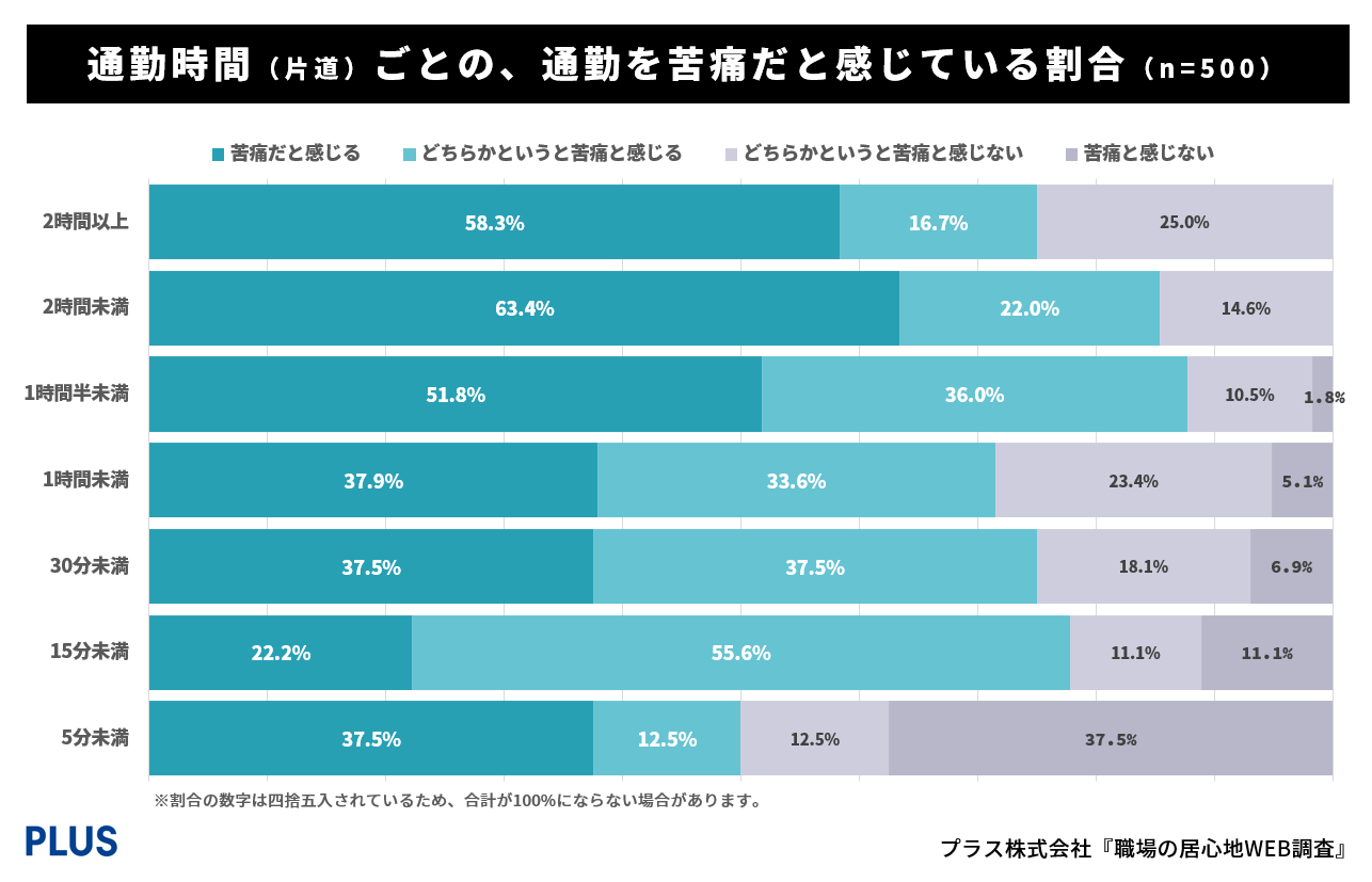 また、「苦痛と感じない」(=濃いグレー色)の回答者は通勤時間が長くなるほど減少しており、最も通勤時間の長い「2時間未満(=1時間半以上2時間未満)」と「2時間以上」の群では0人という結果になっています。