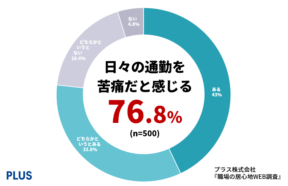 電車・バスを主な通勤手段とする会社員・公務員のうち76.8%は通勤時間が「苦痛」。通勤時間を苦痛と感じる人は、そうでない人と比べて仕事へのモチベーションや会社への貢献意欲が低い。