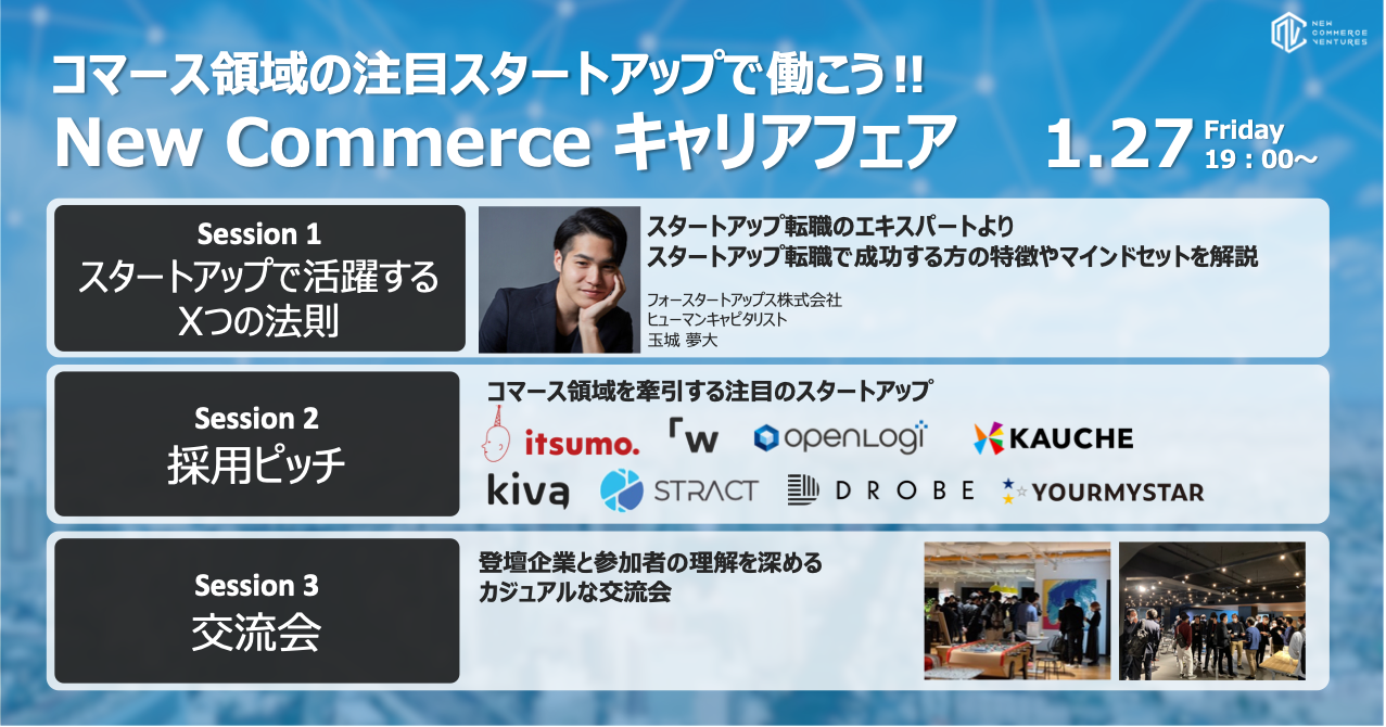 小売・流通のDXを支援するNew Commerce Ventures株式会社(本社:東京都品川区、代表取締役:松山馨太・大久保洸平、以下NCV)は、2023年1月27日(金)にコマース領域特化のオンライン合同採用イベント『New Commerce キャリアフェア』を開催します。