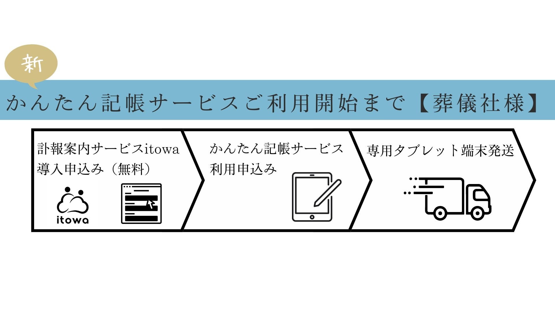 訃報サービスitowaを導入した葬儀社様は、かんたん記帳サービスの利用を申し込むことができます。(端末利用に関しては、月額利用料のみが発生)