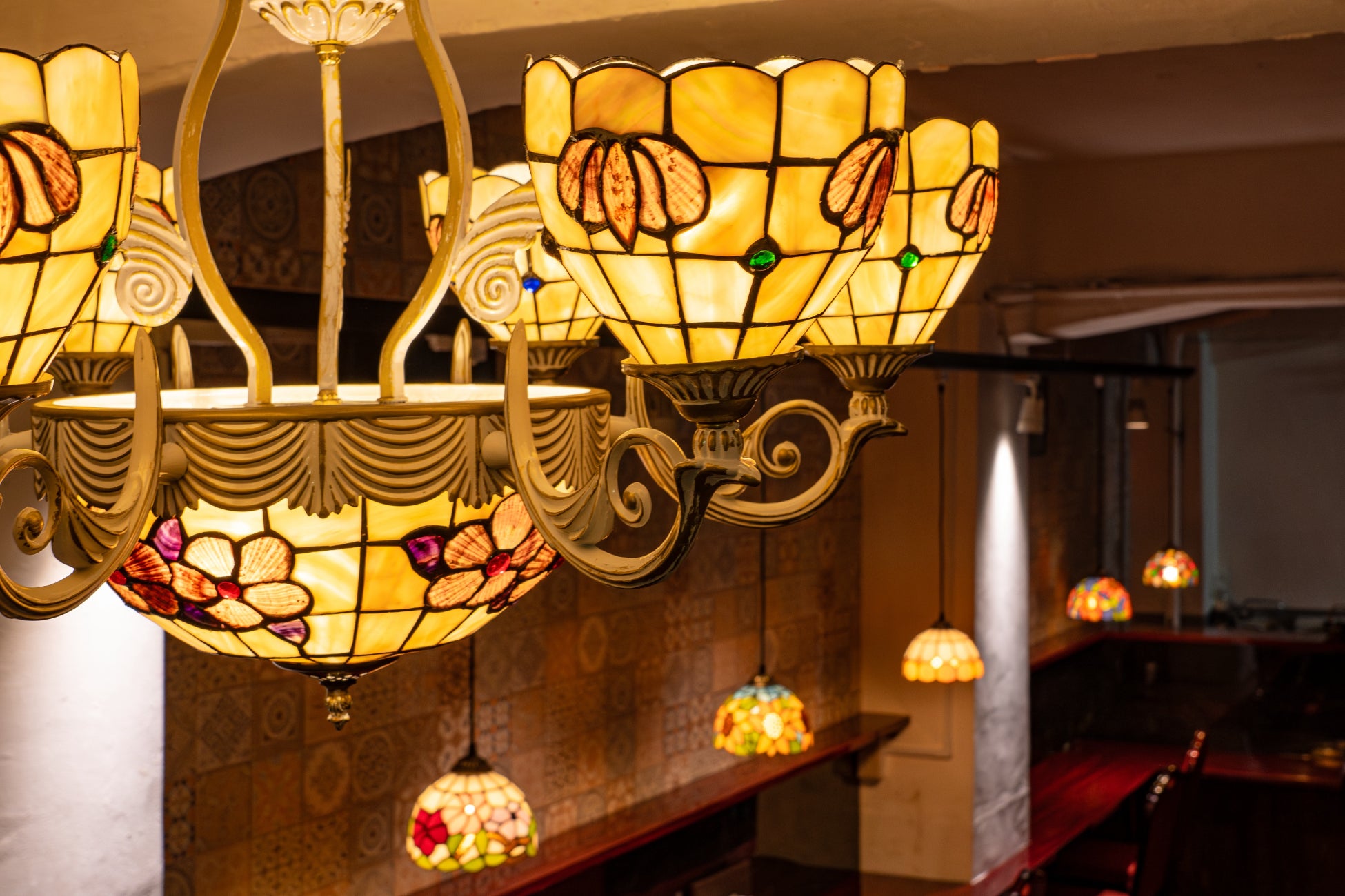 店内は、創業者の出身地である港町横浜の古き良き時代、「大正ロマン」「和洋折衷」をイメージしたノスタルジックな空間デザインです。ステンドグラスやローズウッドのカウンターなど、生まれ育った横浜の歴史を感じさせる世界観を表現しました。壁に飾られた版画の数々は、大正・昭和時代に活躍した偉大な版画家・棟方志功氏の作品が飾られています。