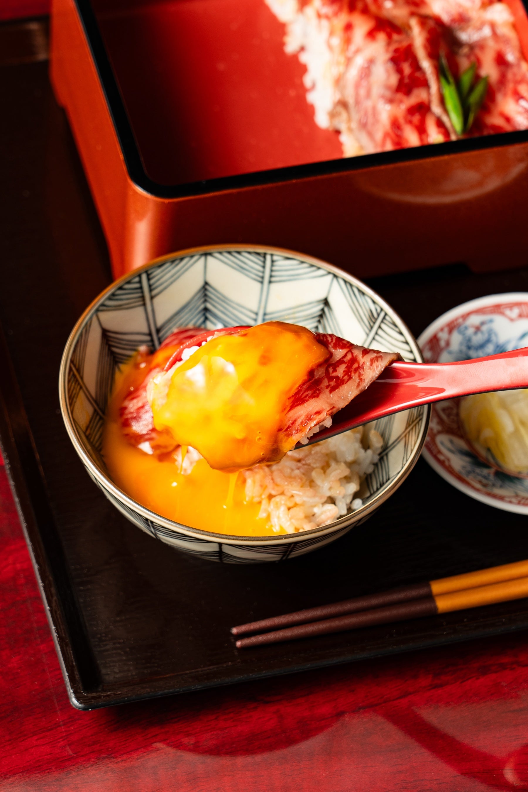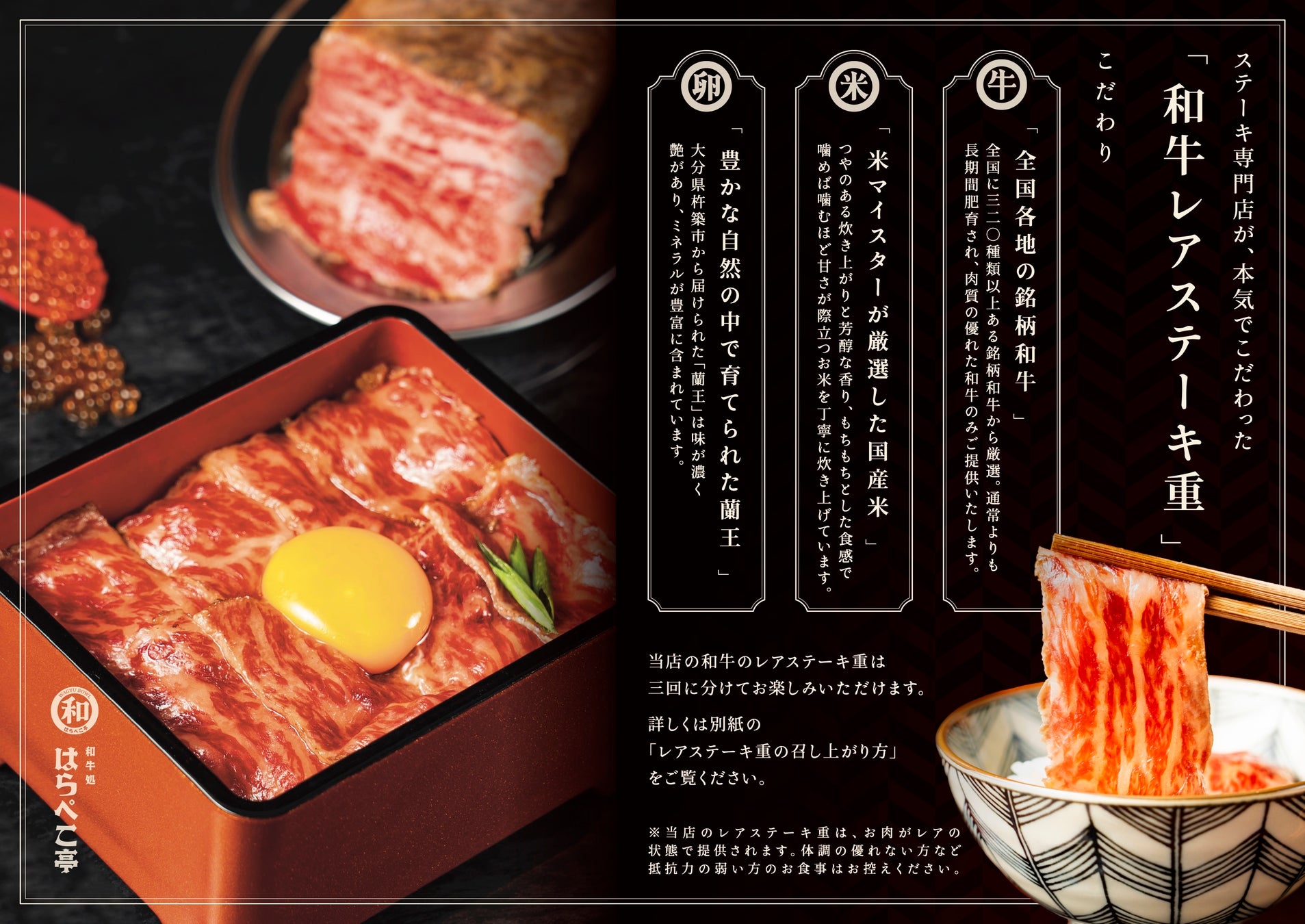 「和牛処 はらぺこ亭」では、全国の銘柄和牛からの厳選部位、米マイスターが選んだ国産米とミネラルの豊富な卵黄が特徴の卵「蘭王」にもこだわり、和牛本来の美味しさと記憶残る空間を楽しめる店内にて、こだわりの和牛レアステーキ重を提供します。