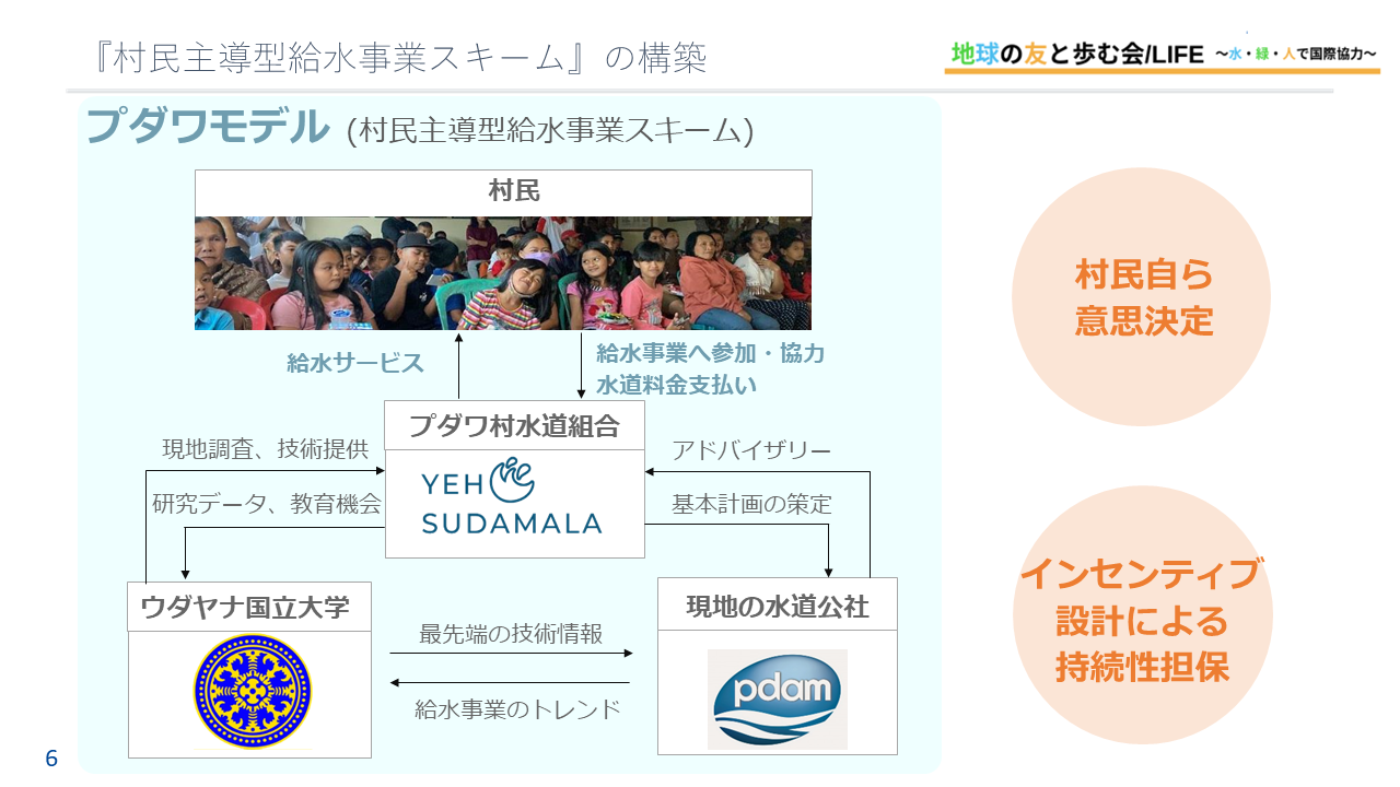この賞は、LIFEの理念を素直に受け入れて事業を遂行してくれた若者たちの熱意と努力により頂くことができたと思っています。また、この活動に全面的にご協力を頂いたウダヤナ大学の皆さま、およびバリ島の水道公社の皆さまに感謝を申し上げます。そして、実際に給水管敷設などの力仕事に携わり、自ら水道料金システムを作り上げたプダワ村の人たちの頑張りを讃えたいと思います。これからも村の人たちが長年にわたって水道運営を継続していくことを願っています。