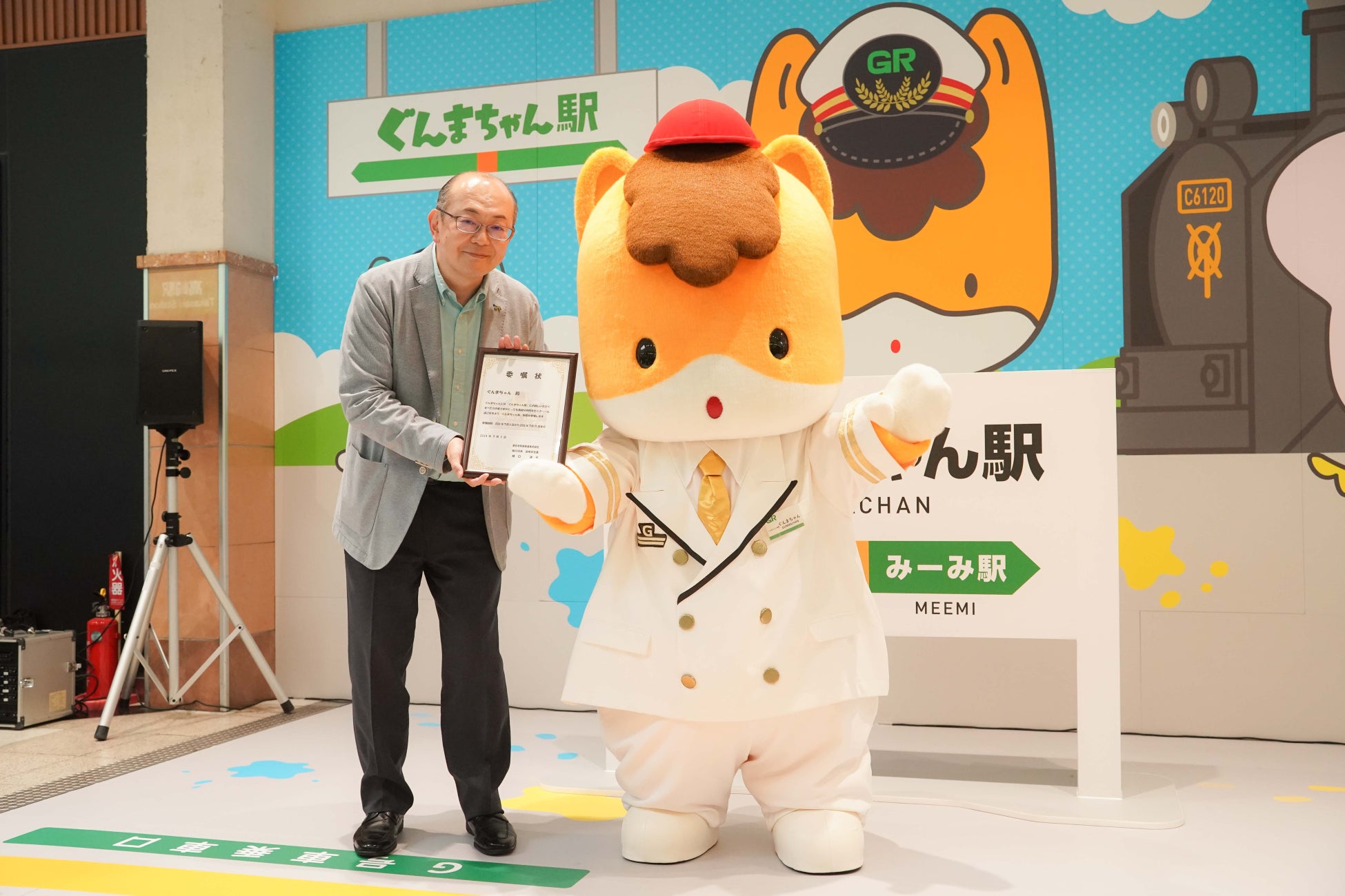 ぐんまちゃん駅スタートとなる7月1日(月)、「ぐんまちゃん駅」駅長委嘱状授与式が行われ、ぐんまちゃんは晴れて、駅長に就任しました。※ぐんまちゃんが駅長に就任するのは初。