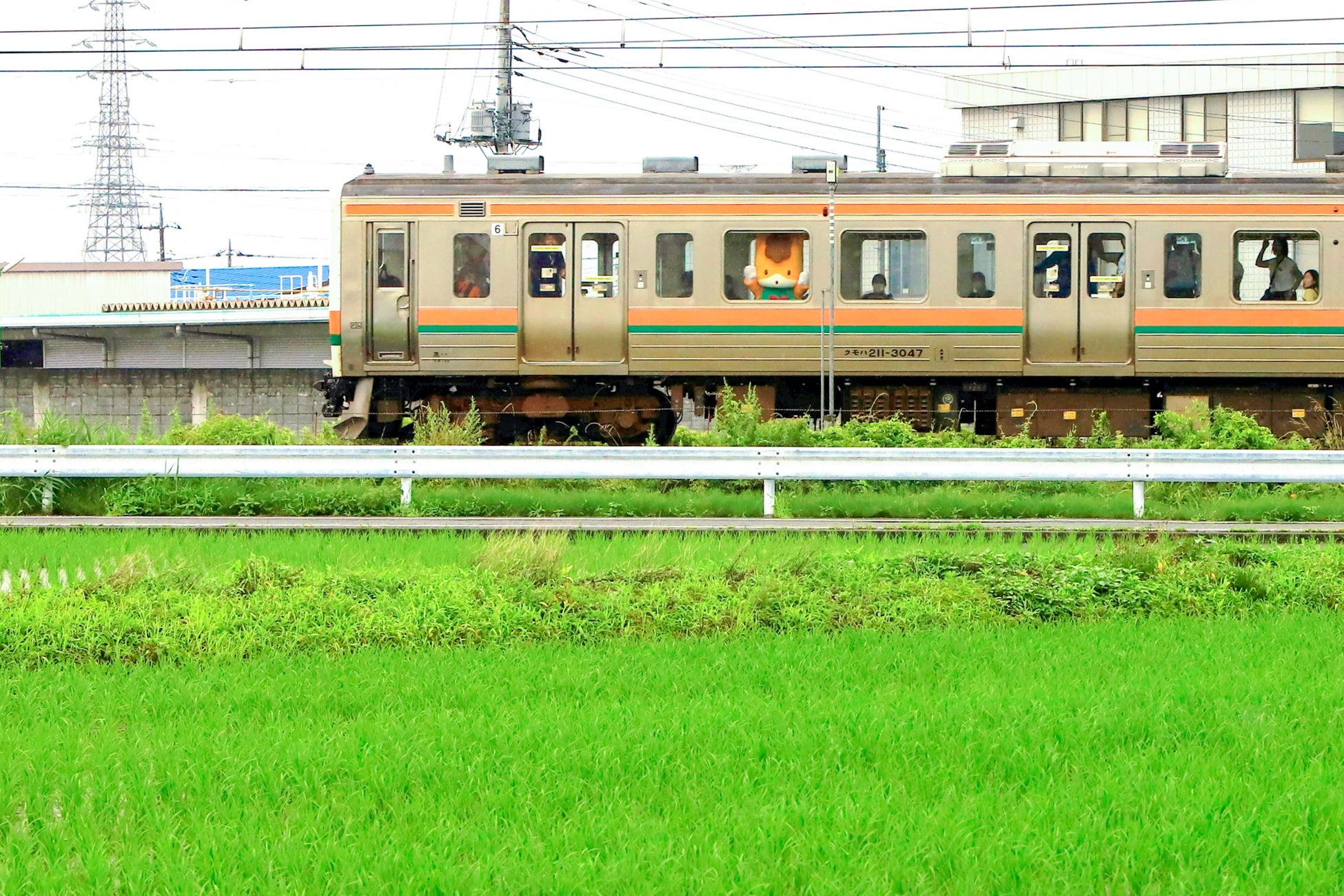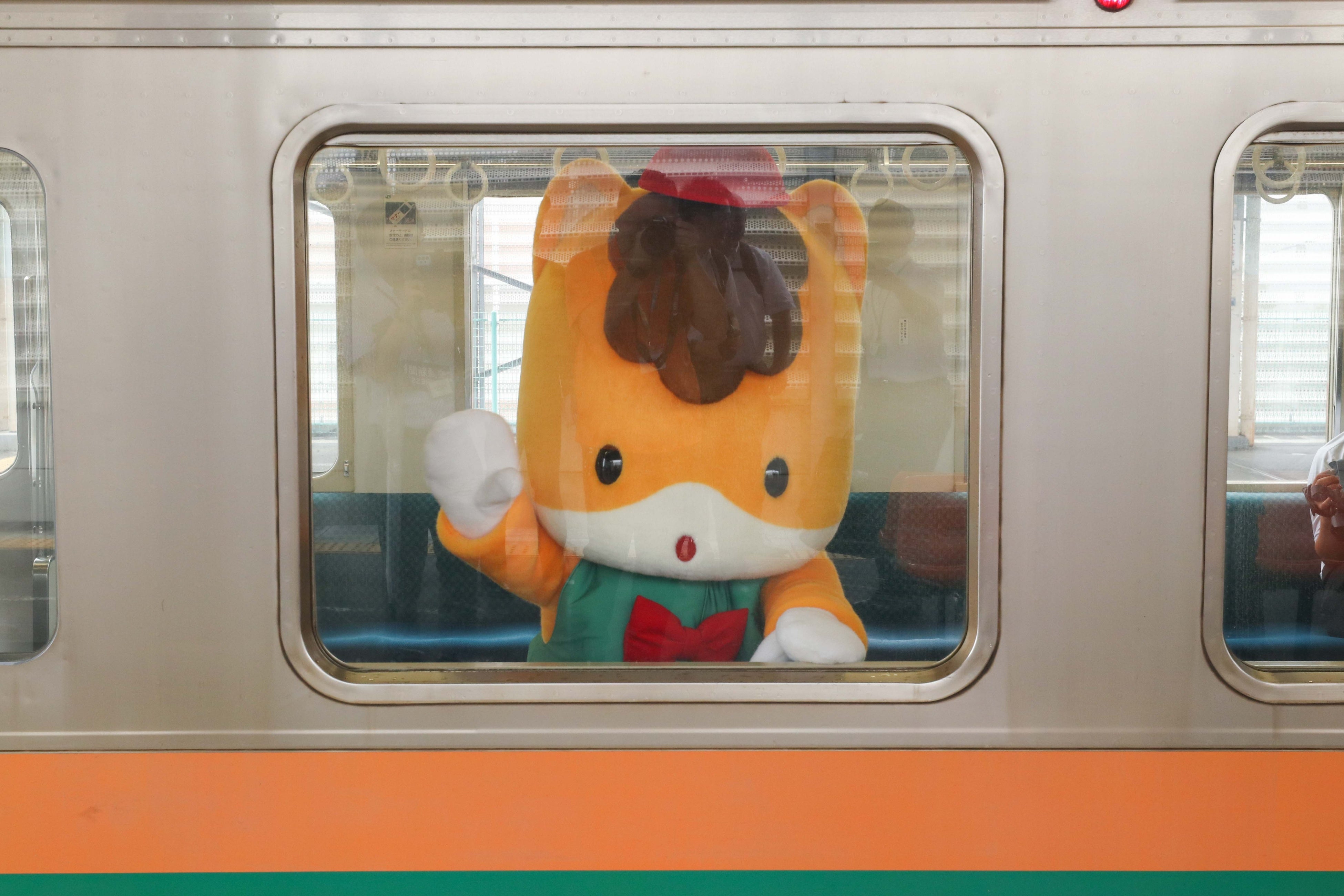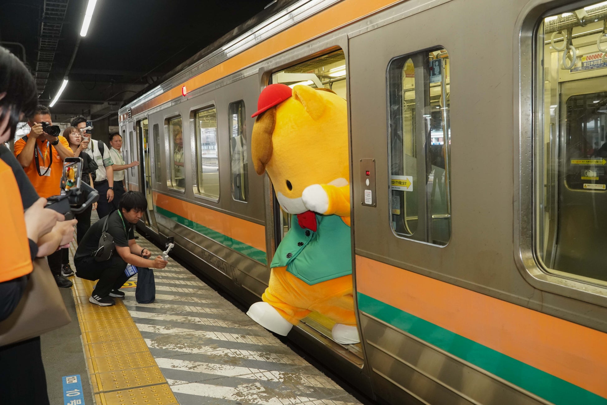 ぐんまちゃんは駅長就任日となる7月1日(月)、群馬県庁を出発し、JR前橋駅へ。8時50分、JR前橋駅2番線ホームから電車に乗り込み、一路、JR高崎駅へ向かった。