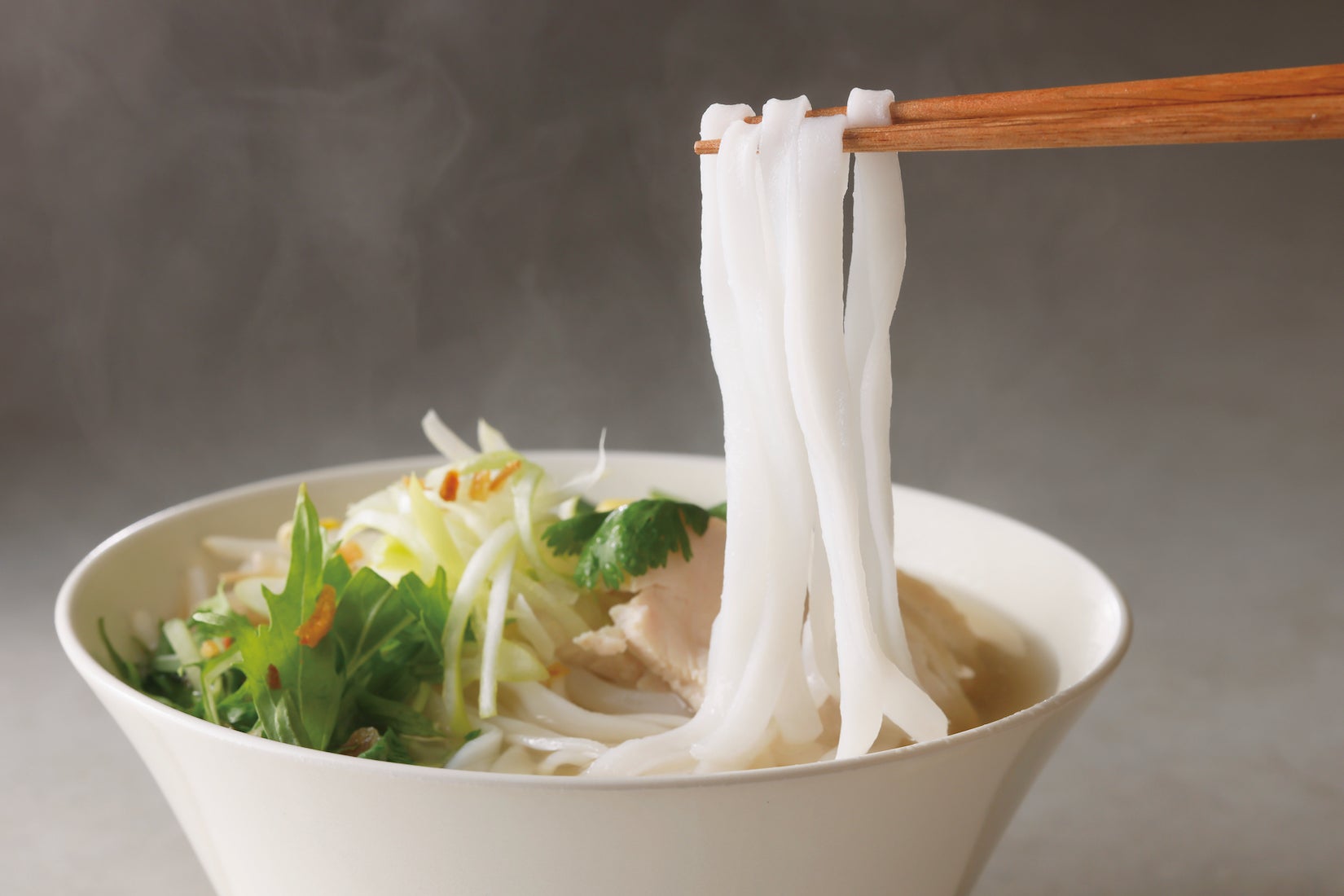 米粉と馬鈴薯でん粉のみで作るグルテンフリーの米麺はもちろん、付属のチキンスープもグルテンフリーにこだわりました。鶏出汁の旨味と、昆布・ホタテを絶妙に配合したオリジナルスープが誕生。