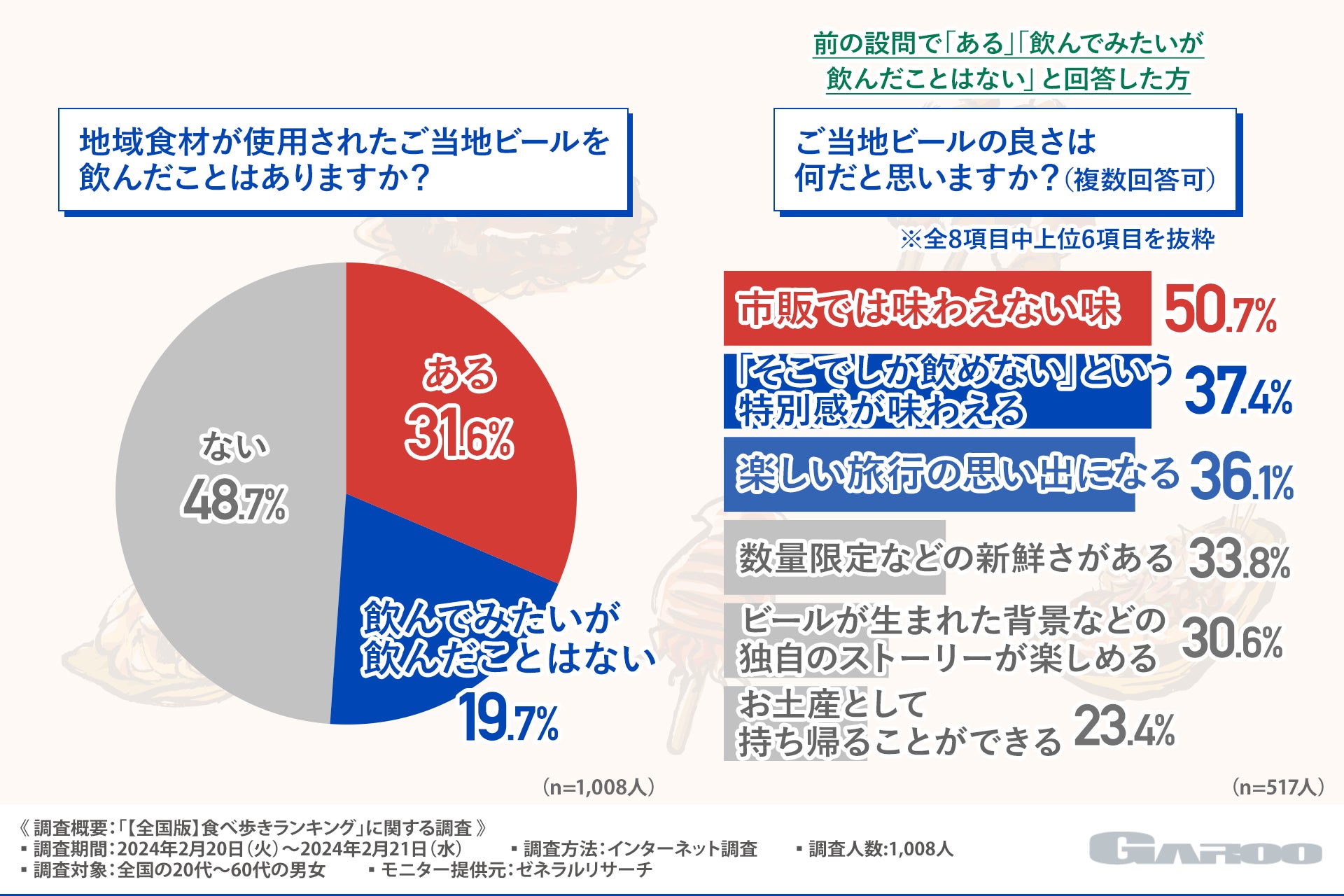 「地域食材が使用されたご当地ビールを飲んだことはありますか?」と質問したところ、『ある(31.6%)』『飲んでみたいが飲んだことはない(19.7%)』『ない(48.7%)』という回答結果になりました。
