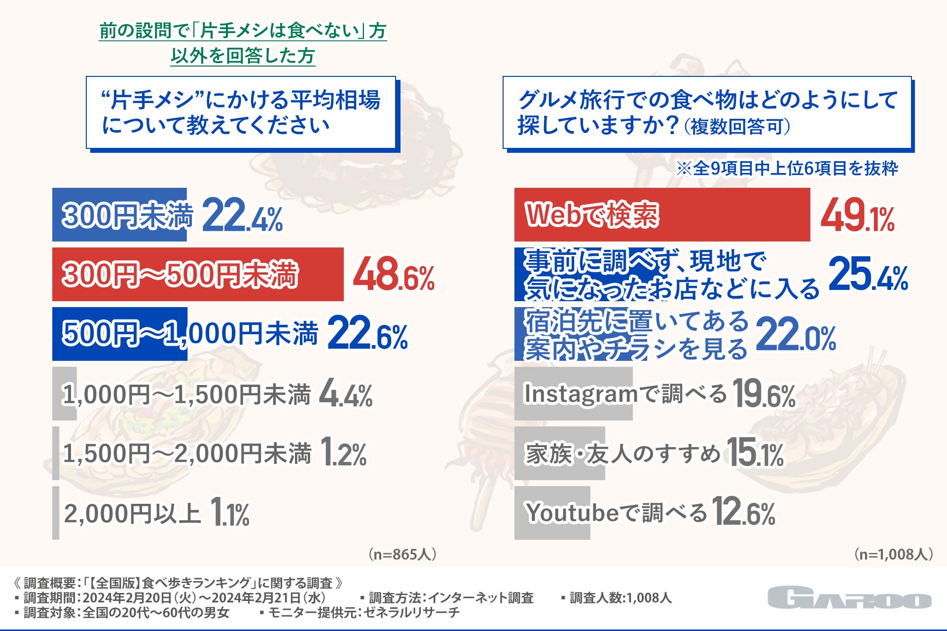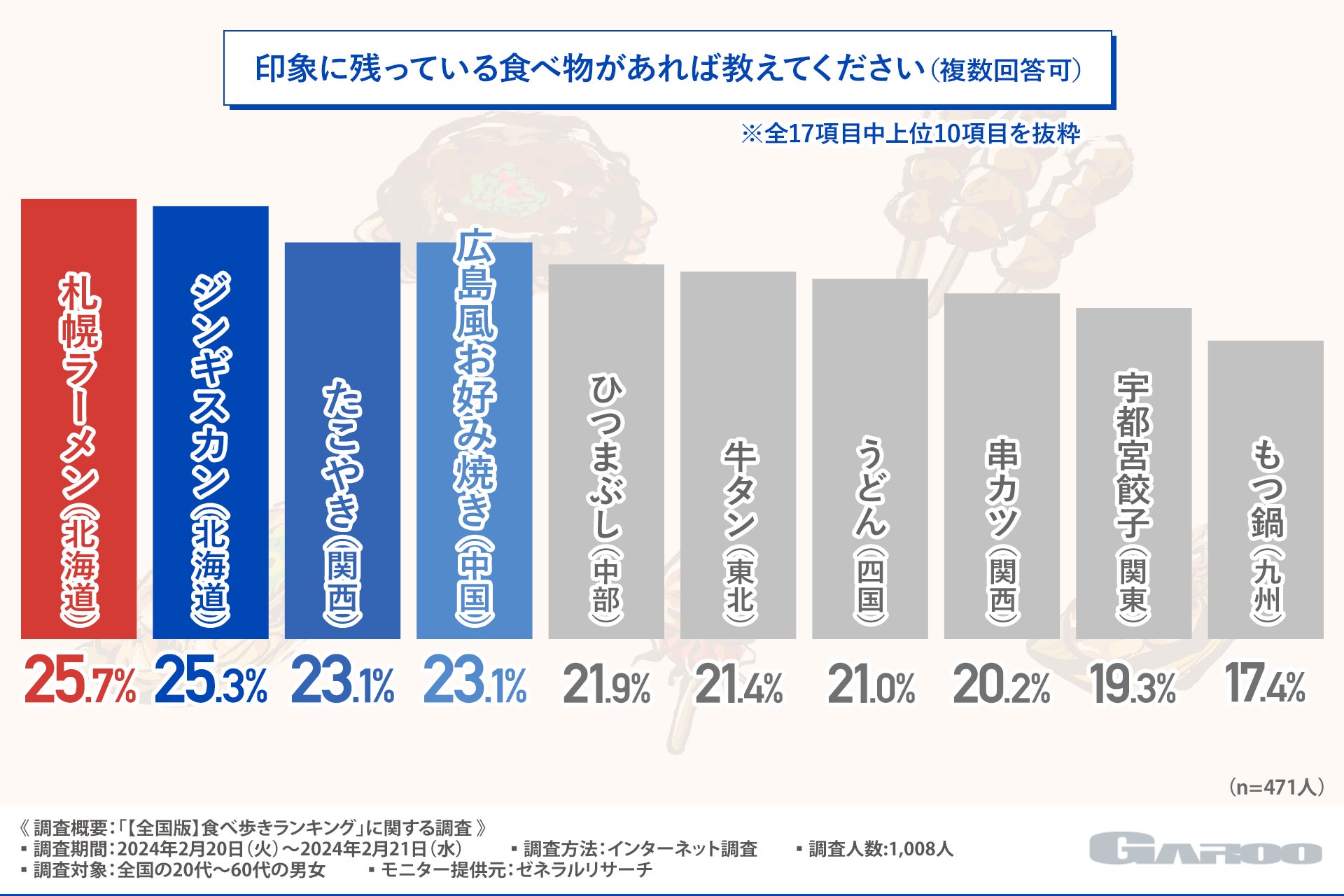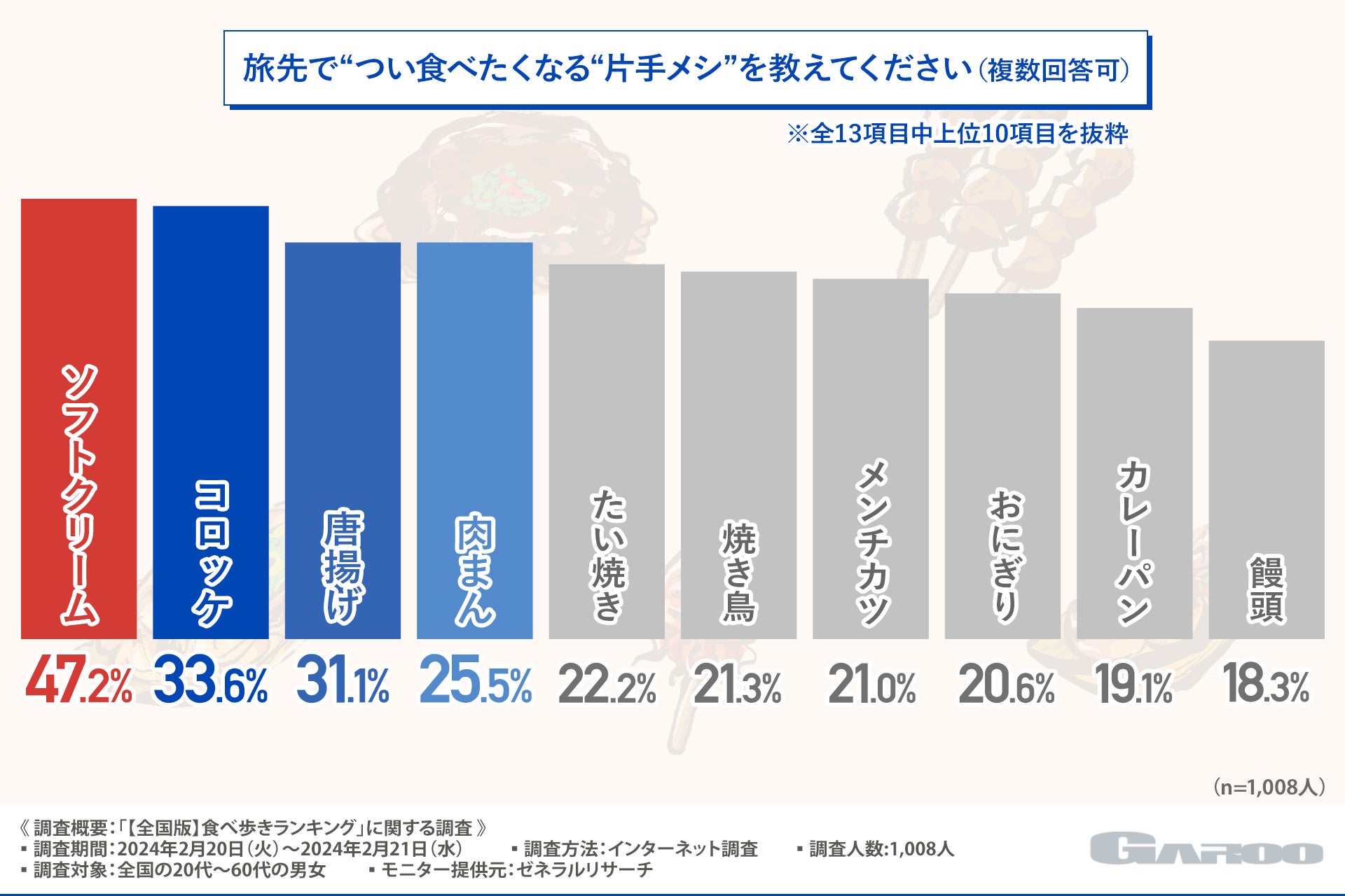 そこで今回、自治体のコンサルタント事業を手掛ける株式会社GAROO (https://ga-roo.com/)は、全国の20代~60代の男女を対象に、「【全国版】食べ歩きランキング」に関する調査を実施しました。