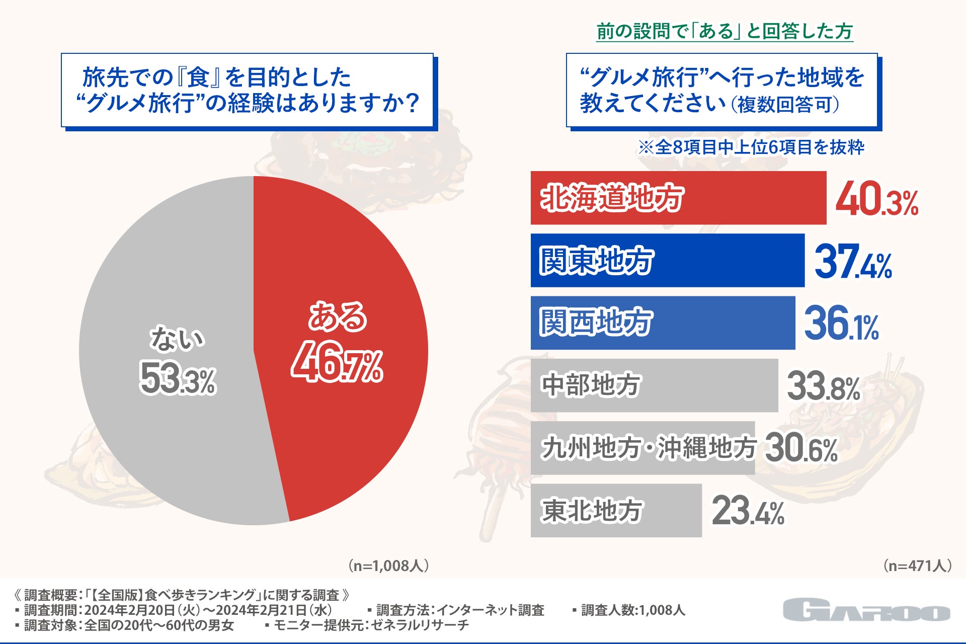 “グルメ旅行”の経験がある方の割合や、“グルメ旅行”として行った地域などが明らかになりました。