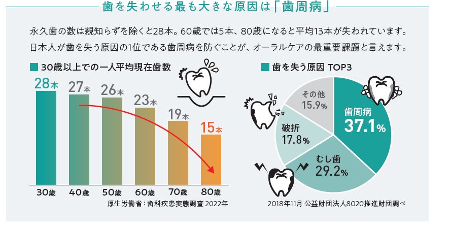 厚生労働省の調査によると、通常は28本ある永久歯が、60歳で平均5本、80歳で13本も失われているそうです。(厚生労働省:歯科疾患実態調査2022年)
