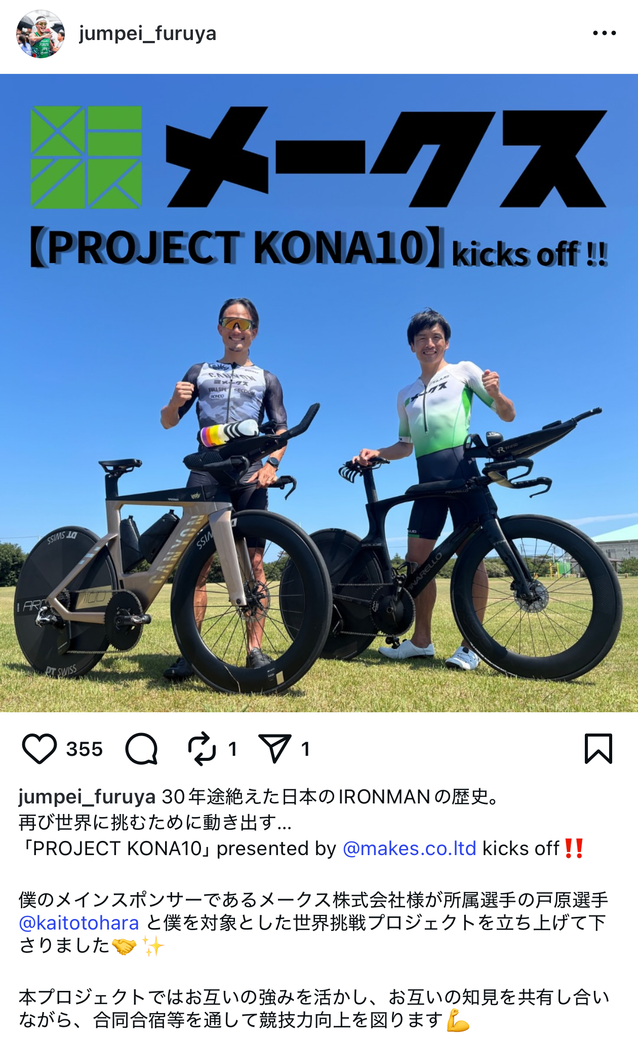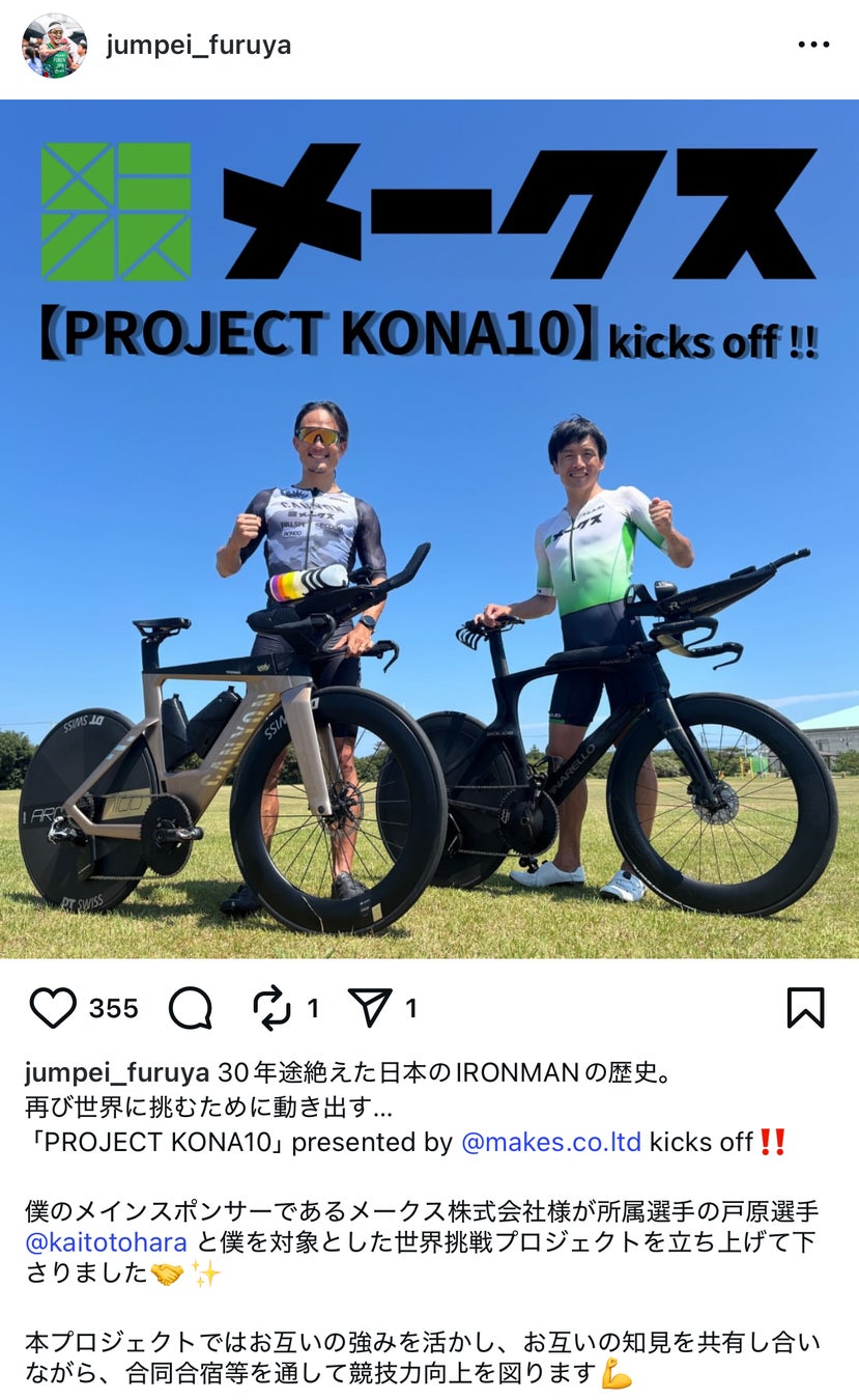 以前から所属選手として活躍している戸原選手との合同プロジェクト【PROJECT KONA10】に参加していただき、アイアンマン世界選手権(KONA)での10位以内入りを目指しています。