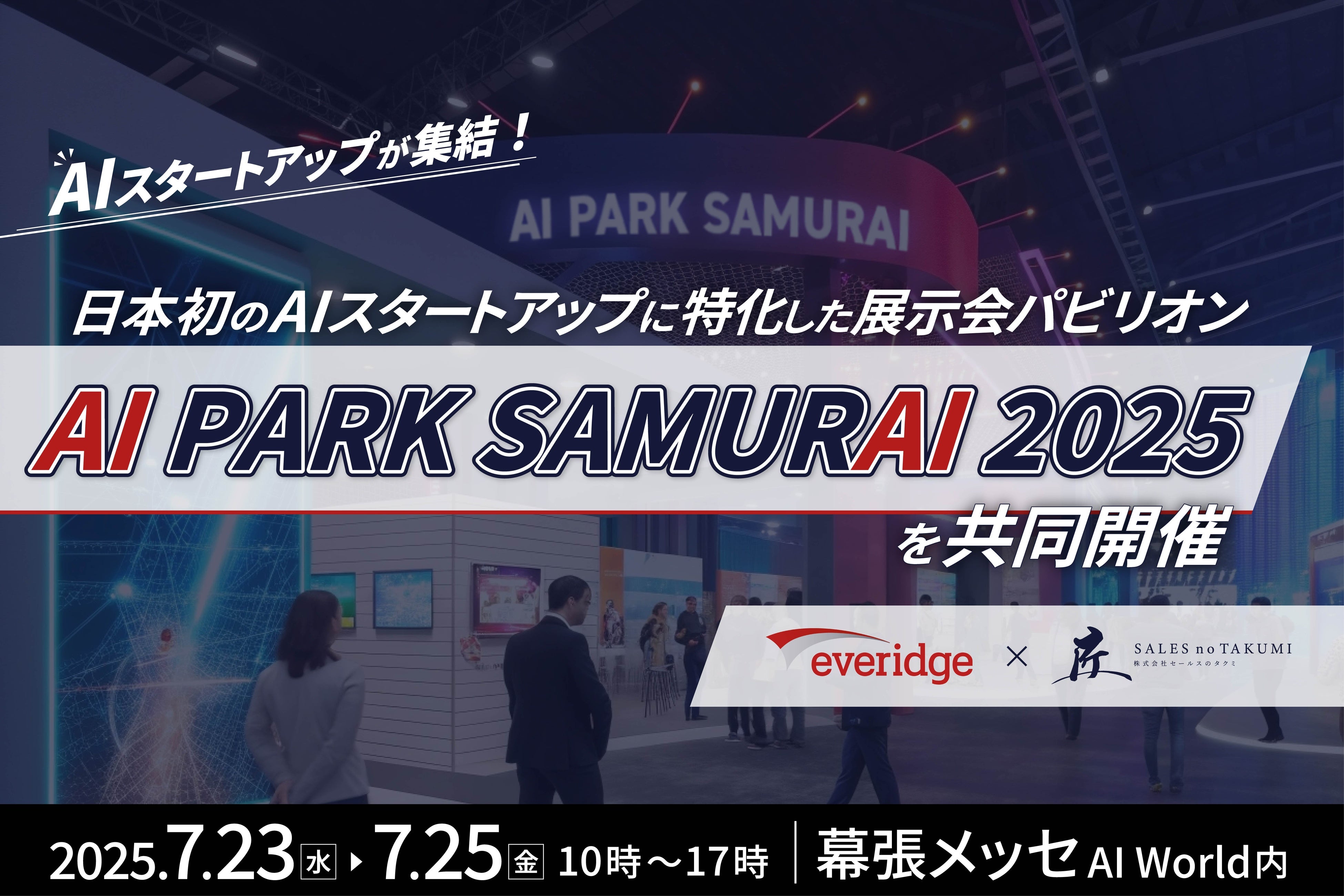 株式会社セールスのタクミ(本社:東京都中央区、以下、セールスのタクミ)は、エバーリッジ株式会社(本社:東京都港区、以下、エバーリッジ)が主催するAI総合展示会『AI World』内において、日本初のAIスタートアップに特化した展示会パビリオン「AI Park SAMURAI 2025」の開催パートナーとして企画運営に参画いたします。