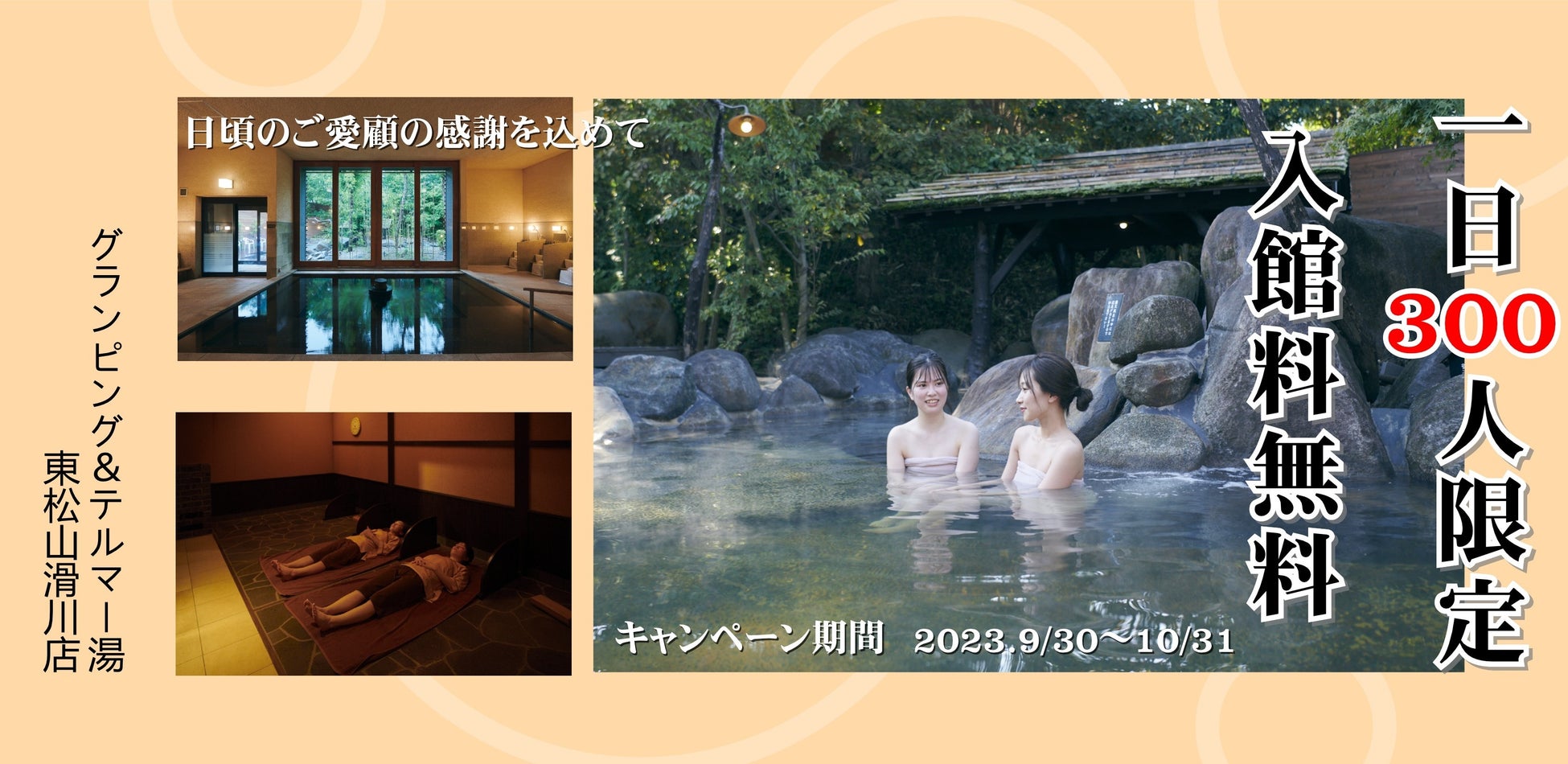 グランピング&テルマー湯東松山滑川店 日頃のご愛顧の感謝を込めて 2023年9月30日(土)~ 10月31日(火)『一日300人限定 入館料無料キャンペーン』開催!