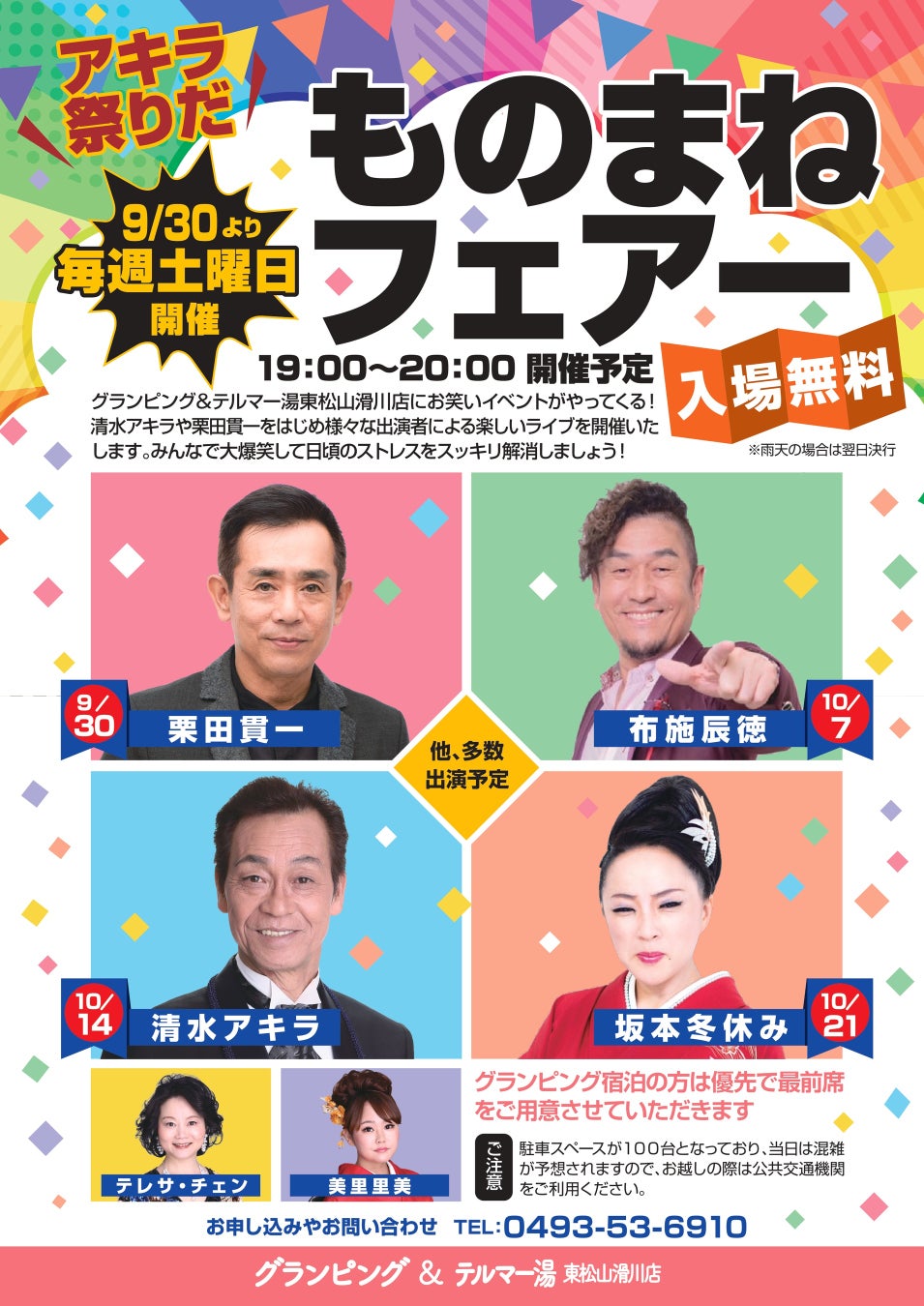 さらに、9月30日(土)より毎週土曜日に、“入場無料”で「アキラ祭りだ ものまねフェアー」イベントも開催。