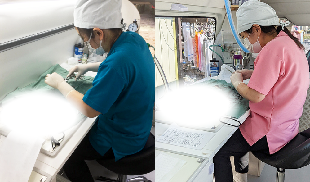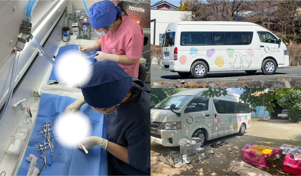 移動式の手術車も完備しているため、猫の過剰繫殖が問題になっている住宅地等、必要な場所へ出向いて一斉に不妊去勢手術を行う活動も行なっています。2024年度、手術車は8回出張をして、713頭の手術を行いました。