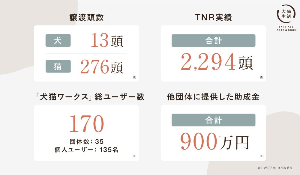 ※1 TNR活動とは:飼い主のいない猫に対し、Trap/捕獲し、Neuter/不妊去勢⼿術を⾏い、Return/元の場所に戻すことで繁殖を防ぎ、地域の猫として1代限りの命を全うさせ、野良猫に関わる苦情や殺処分の減少を⽬指す活動です。