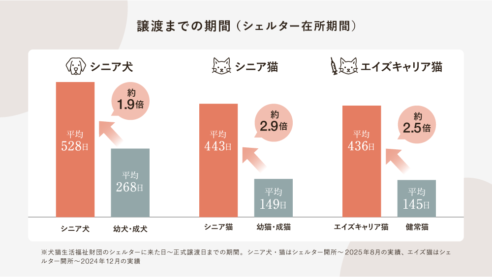 犬猫生活福祉財団の実績では、シニア犬は、成犬・幼犬と比べて1.9倍の期間(平均528日)、シニア猫は、成猫・幼猫と比べて2.9倍の期間(平均443日)、猫エイズ陽性(※3)の猫は、健常猫の約2.5倍の期間(436日)、シェルターにいることが分かっています。また、病気の子、シニアの子は健康維持のための医療費やケアのための人手が、通常よりもかかることが多いのです。