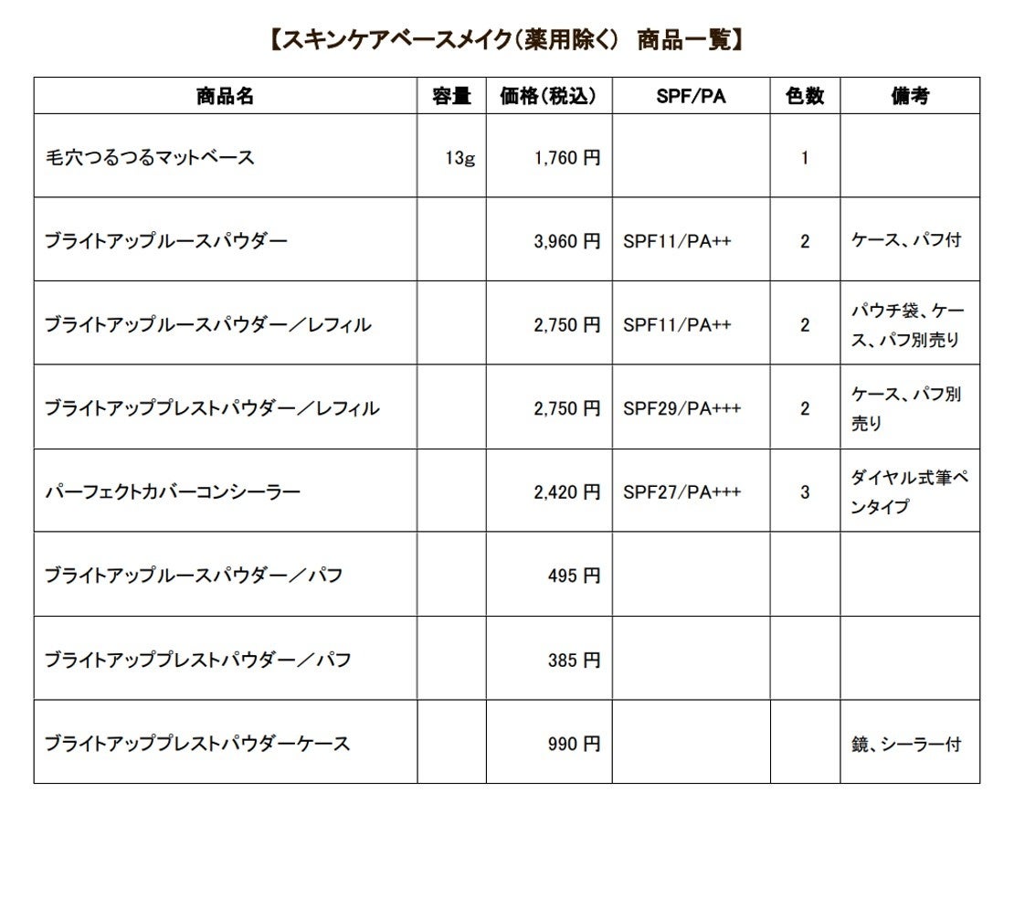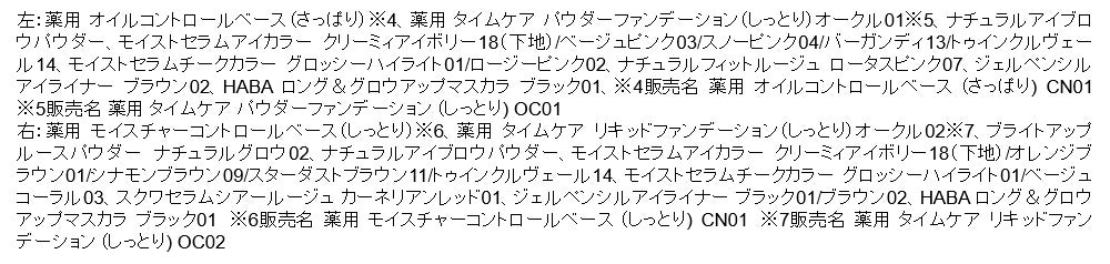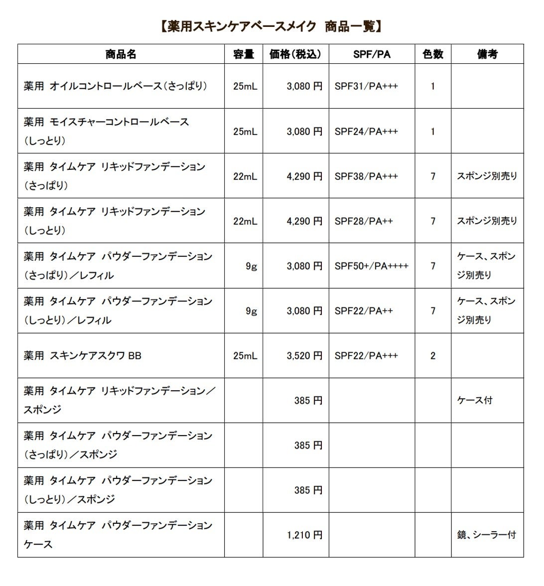※4販売名 薬用 オイルコントロールベース (さっぱり) CN01 ※5販売名 薬用 タイムケア パウダーファンデーション (しっとり) OC01 ※6販売名 薬用 モイスチャーコントロールベース (しっとり) CN01 ※7販売名 薬用 タイムケア リキッドファンデーション (しっとり) OC02 ※11販売名 薬用 タイムケア リキッドファンデーション (さっぱり) OC02 ※12 販売名 薬用 タイムケア パウダーファンデーション (さっぱり) OC02