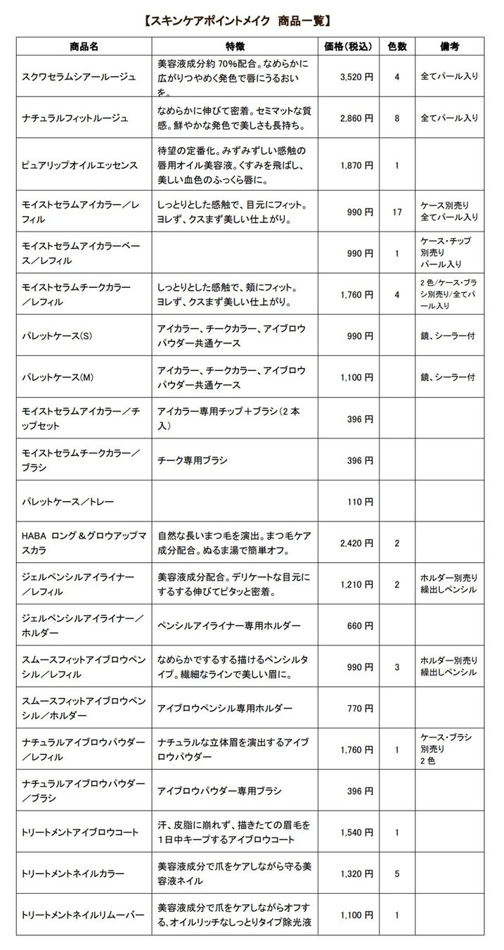 左から:スクワセラムシア―ルージュ(全4色) 3,520円、ナチュラルフィットルージュ(全8色) 2,860円、ピュアリップオイルエッセンス(全1色) 1,870円、HABA ロング&グロウアップマスカラ(全2色) 2,420円、ジェルペンシルアイライナー/レフィル(全2色) 1,210円、ジェルペンシルアイライナー/ホルダー 660円、スムースフィットアイブロウペンシル/レフィル(全3色) 990円、スムースフィットアイブロウペンシル/ホルダー 770円、トリートメントアイブロウコート 1,540円、トリートメントネイルカラー(全5色) 1,320円、トリートメントネイルリムーバー 1,100円