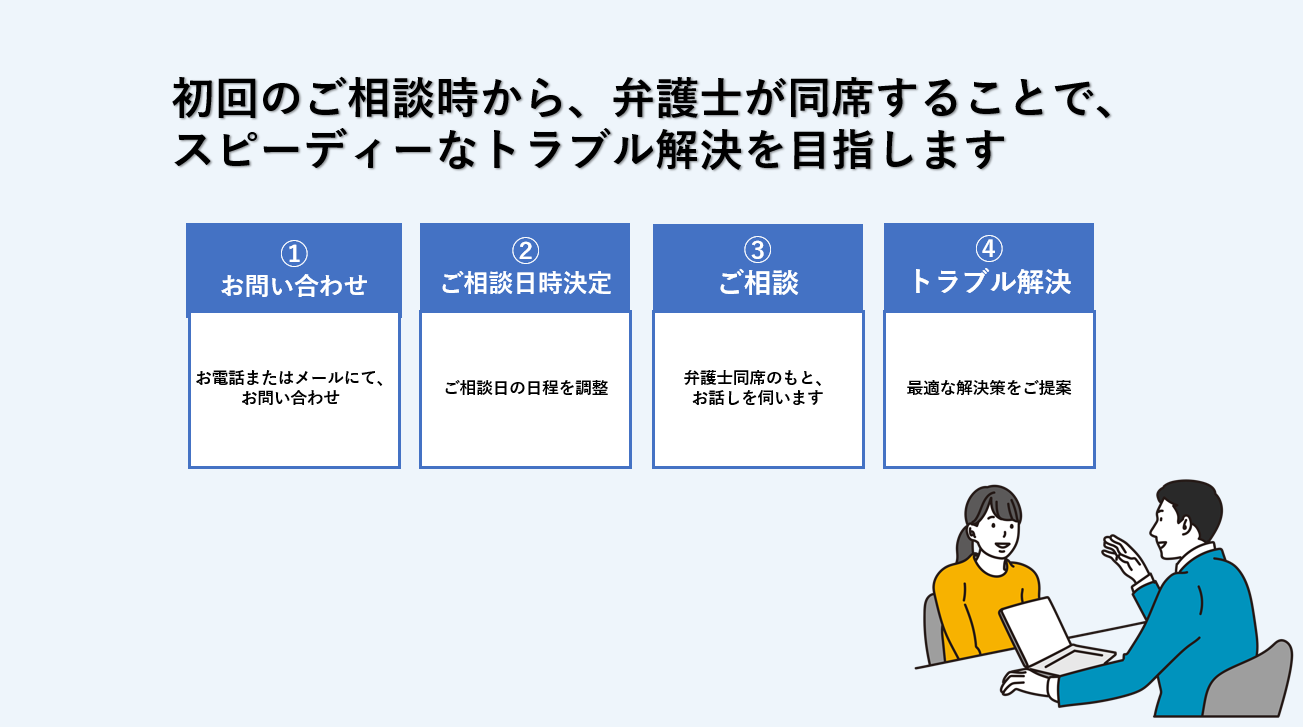 初回のご相談から弁護士が同席することで、より鮮明にトラブルの内容を把握でき、個々の状況に応じた解決策の提案が可能となります。
