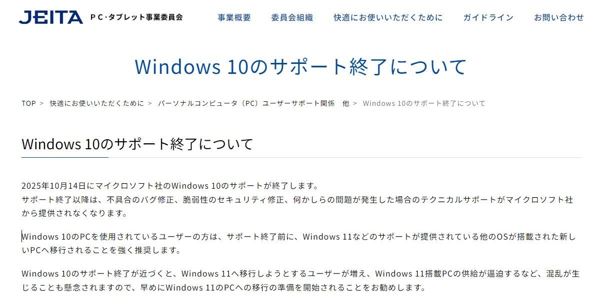 一般社団法人電子情報技術産業協会(JEITA)のPC・タブレット事業委員会では、Windows 10のサポート終了に関するドキュメント(Webページ)を公開しました。
