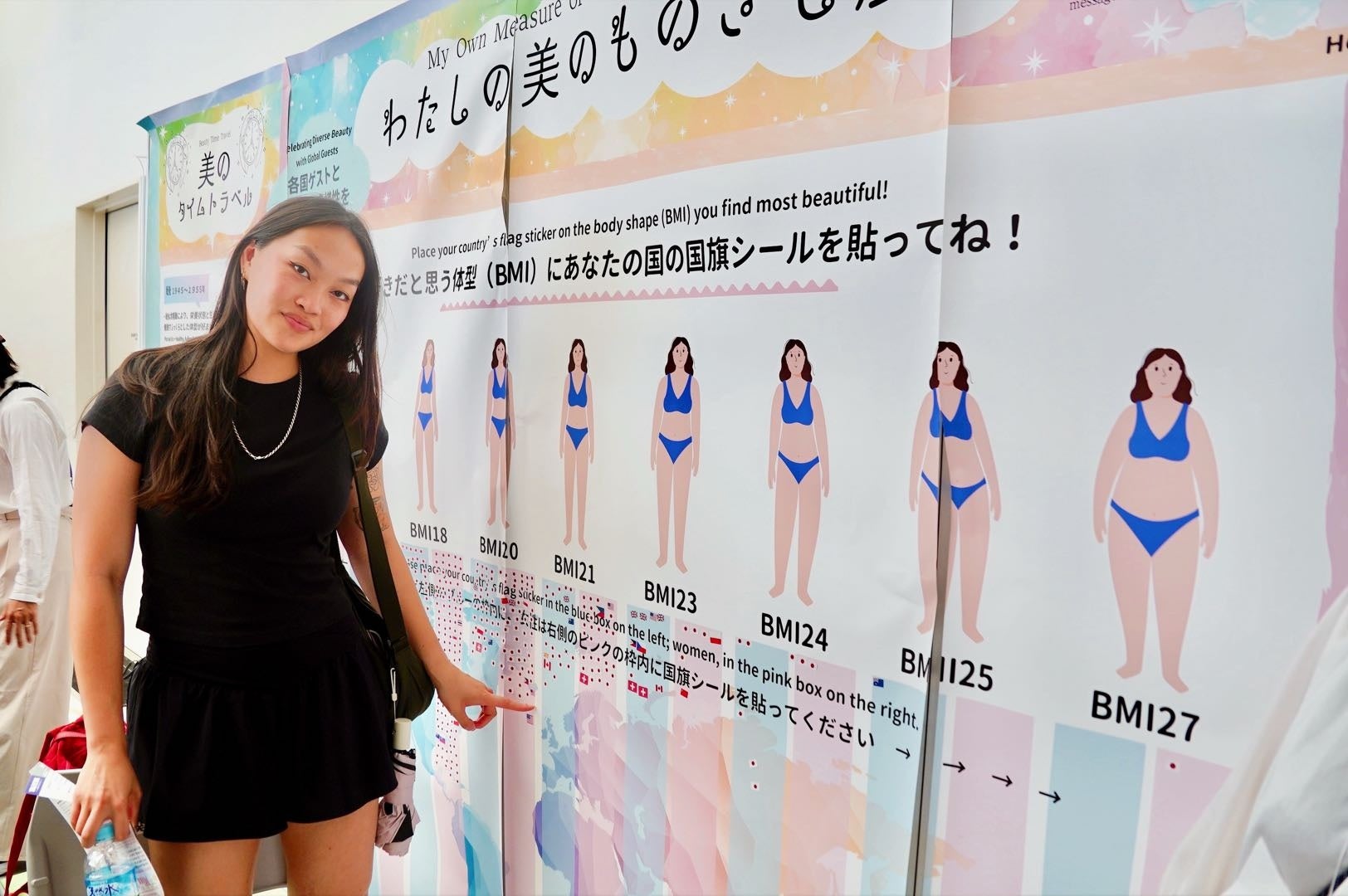 目玉展示のひとつとなったのが世界37カ国の国旗シールが貼られた「わたしの美のものさし展」。ゲストが好ましいと思うBMIイラストに自身の国旗シールを貼り、その理由や痩せたい願望が強く、健康を犠牲にしがちな日本女性に向けたメッセージを付箋で貼っていく展示です。目的は「細いだけではない、世界の美しさの多様性を視える化すること」。語学堪能な日本文化を世界にPRする親善大使、Miss SAKEファイナリストたちがナビゲーターとなり、37カ国の参加を実現しました。