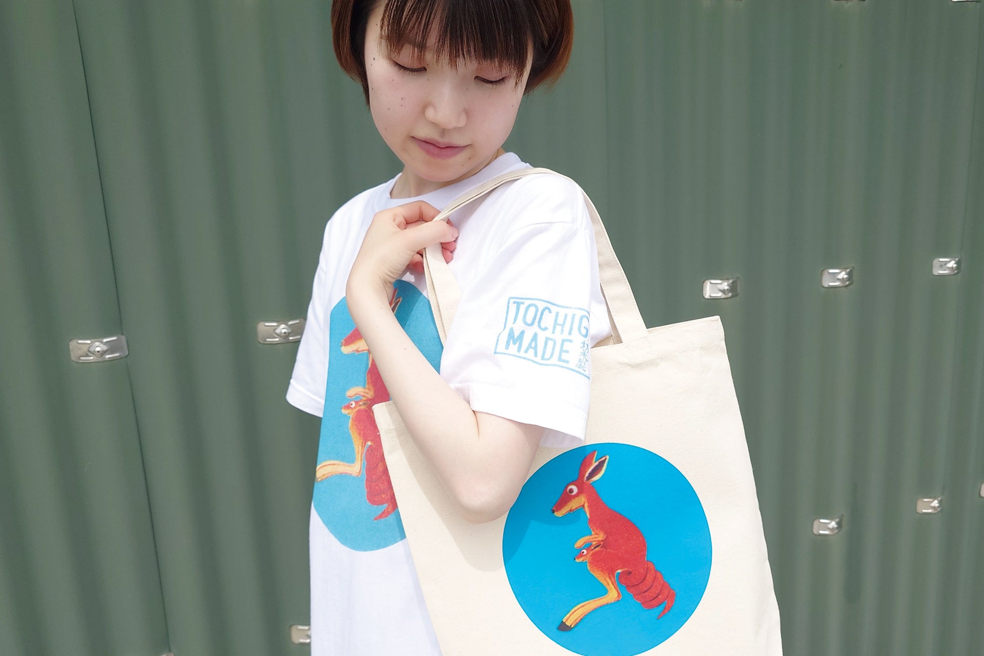「村田発條」と「トチギマーケット」の第2弾コラボレーションは、村田発條の社内で昭和の時代から活躍してきた“交通安全カンガルー”をモチーフに、POPでオシャレな西海岸カラーのTシャツ&トートバッグです。