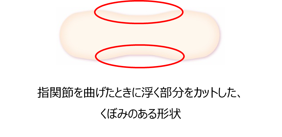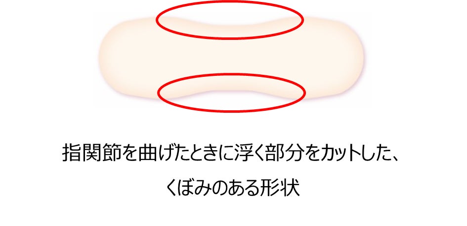 絆創膏が剥がれやすくなる原因は、指関節を曲げたときに浮いてしまう部分からの水の侵入であることに着目し、くぼみのある形状にしました。