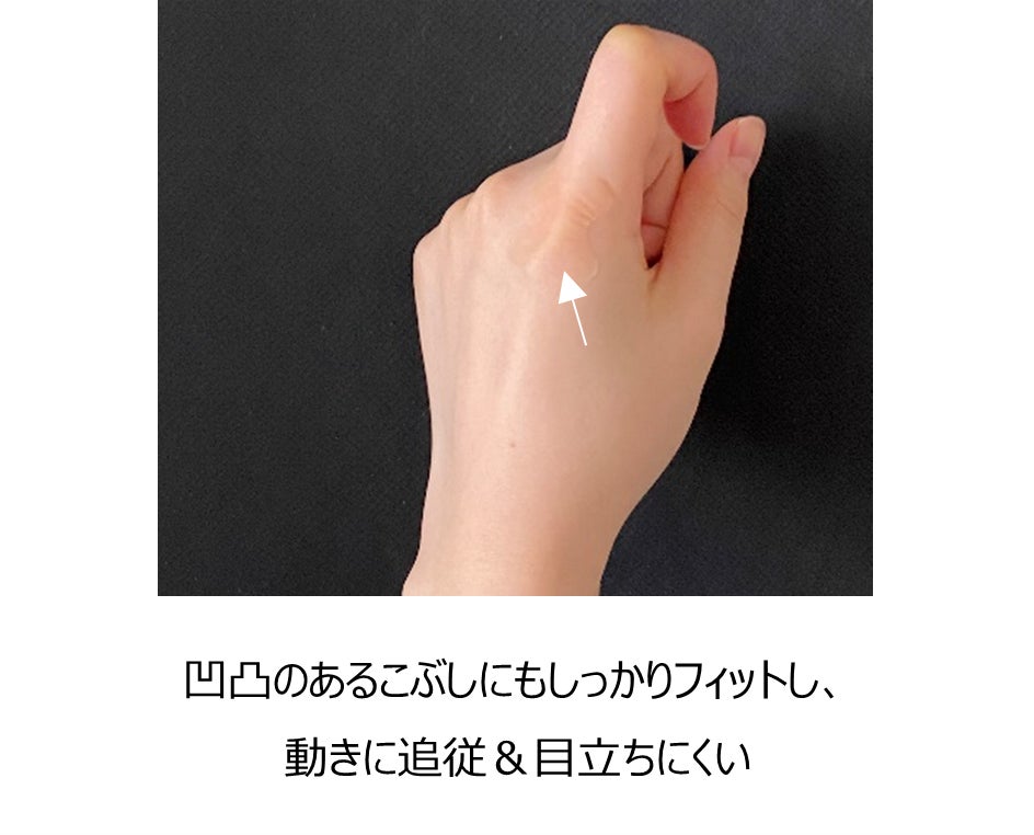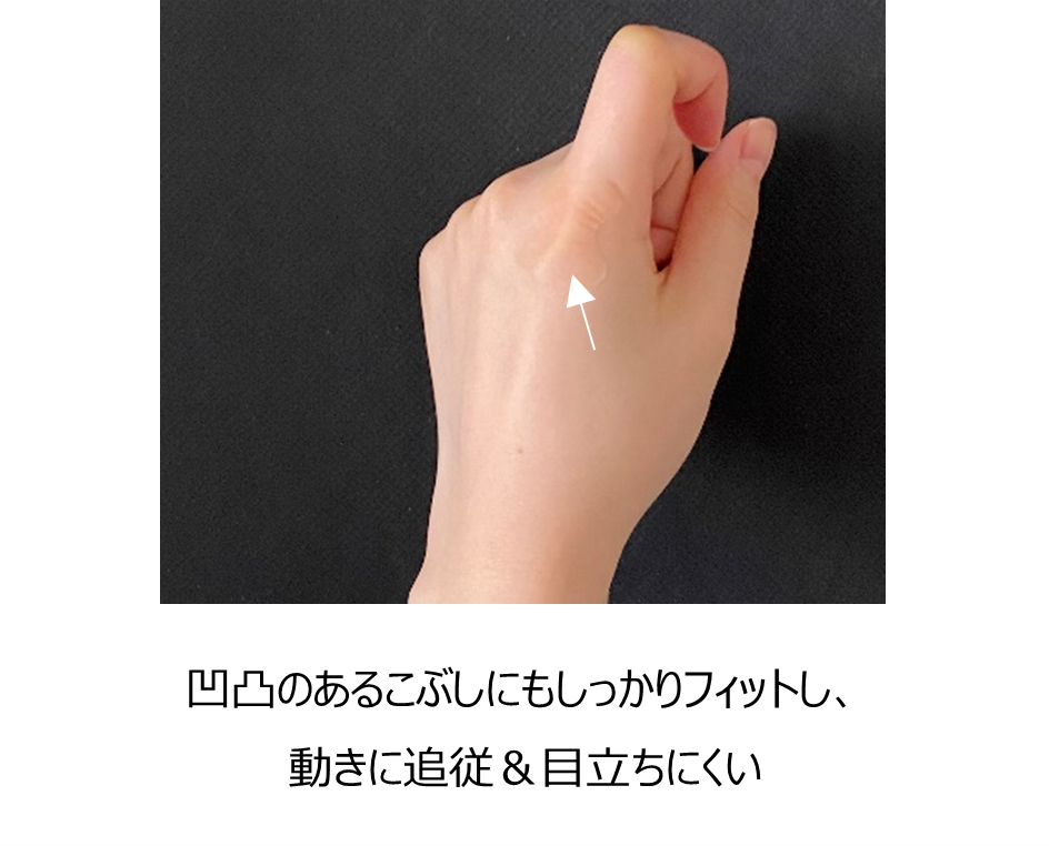 こぶしや指の股など凹凸のある部分にもフィットする新形状で、絆創膏を上手く貼れない場所のケガにも貼ることを諦める必要はありません。