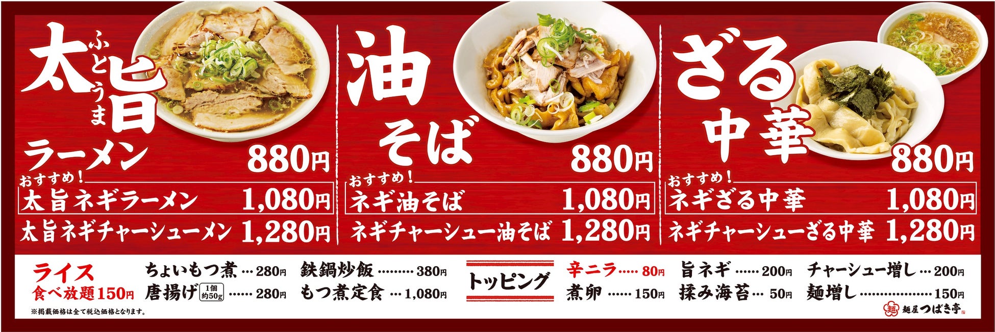 本店では、独自開発の極太麺を使用した「太旨ラーメン」「油そば」「ざる中華」の3大主力商品を提供。1杯880円の同一価格で選べ、誰でも気軽に“麺の旨さ”を体験していただけます。