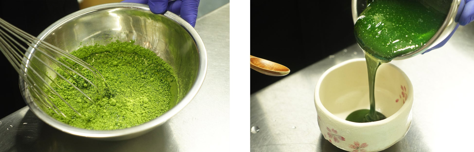 濃厚抹茶ソースは、口当たりと茶葉の芳醇な香りや抹茶本来の深い旨みが出るようにこだわって います。口に含んだ時に感じる奥行きや風味の広がりを感じるように、一般的なフォンデュの商品 で使用されるチョコレートソースではなく「本葛」を使用しました。京都府産石臼挽き一番茶の 風味が一番活きる配合になるよう試作を重ね、甘みの調節にはきび糖を使用しています。これに よりダイレクトな甘さは控えつつも味に深みが増し、バランスの取れた味わいとなっています。